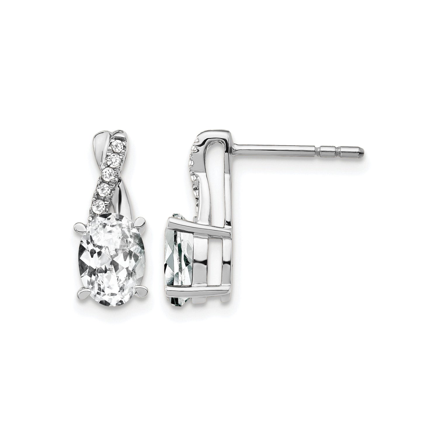 14k White Gold Stud Earrings with Oval White Topaz, Twisted Design, Diamond Accents