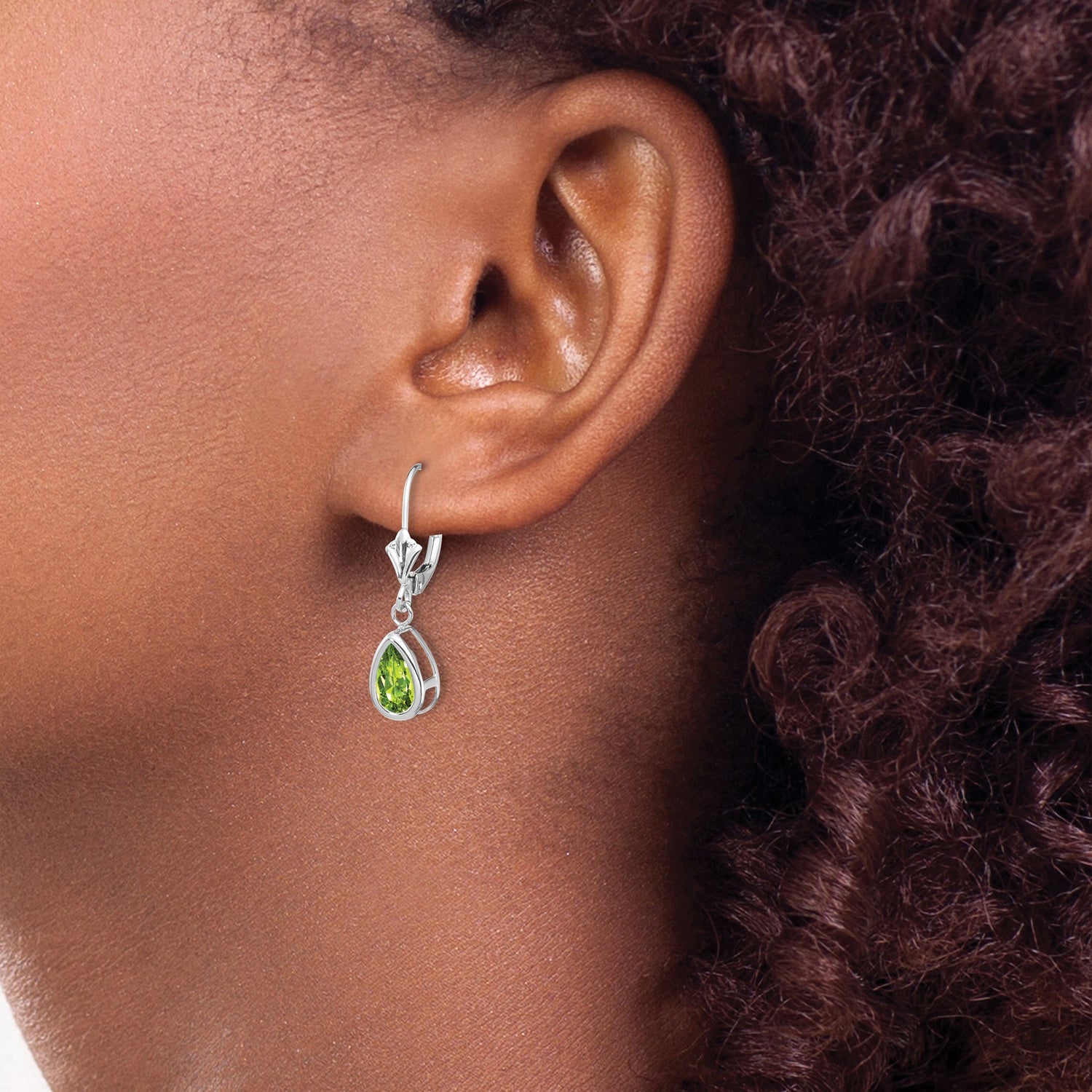 14k White Gold Dangle Earrings with Pear Shaped Peridot in Bezel Setting Leverback Design