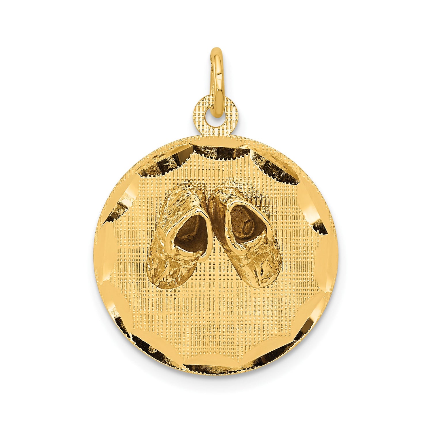 Discover the charm and elegance of our Engravable Baby Shoes On Round Disc Charm Pendant, crafted meticulously in real 14k yellow gold. This exquisite piece is a perfect addition to your jewelry collection, offering a blend of sentimental value and sophisticated style. Ideal for new parents or as a cherished keepsake, this pendant captures the precious moments of infancy in a timeless design.
