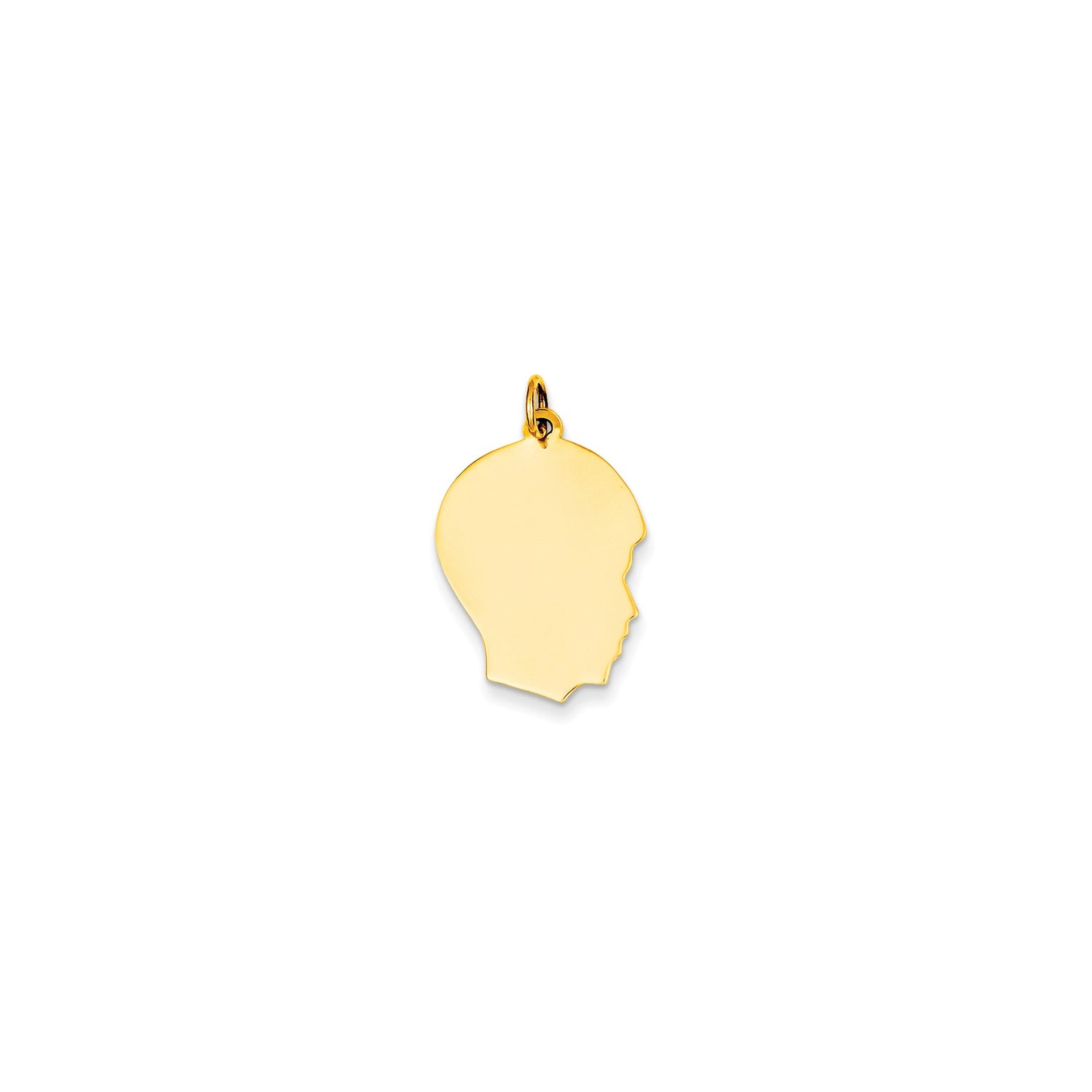 Discover the timeless elegance of our Plain Medium .013 Gauge Facing Right Engravable Boy Head Charm Pendant, expertly crafted in real 14k yellow gold. This exquisite piece is a perfect blend of simplicity and sophistication, designed to capture cherished moments and memories.