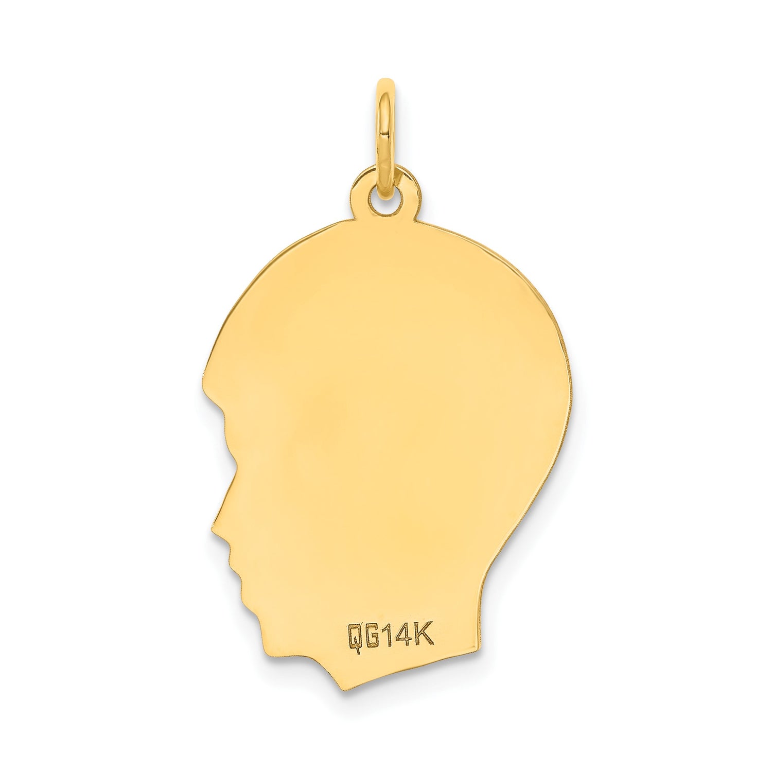 Celebrate the special moments in life with our Plain Medium .035 Gauge Facing Right Engravable Boy Head Charm Pendant, meticulously crafted from genuine 14k Yellow Gold. This exquisite piece embodies elegance and personalization, making it a treasured keepsake or a thoughtful gift for loved ones.