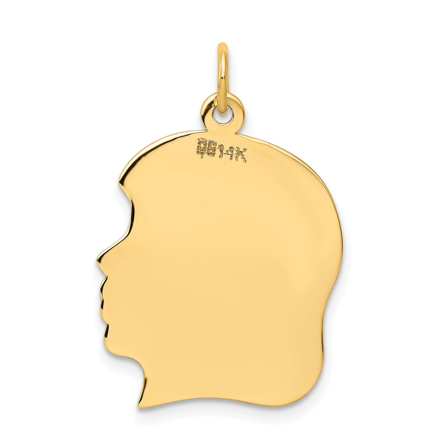 Elevate your jewelry collection with our exquisite Plain Large .013 Gauge Facing Right Engravable Girl Head Charm Pendant, meticulously crafted in real 14k yellow gold. This stunning pendant is a timeless piece, perfect for capturing cherished memories or personalizing with a special engraving.
