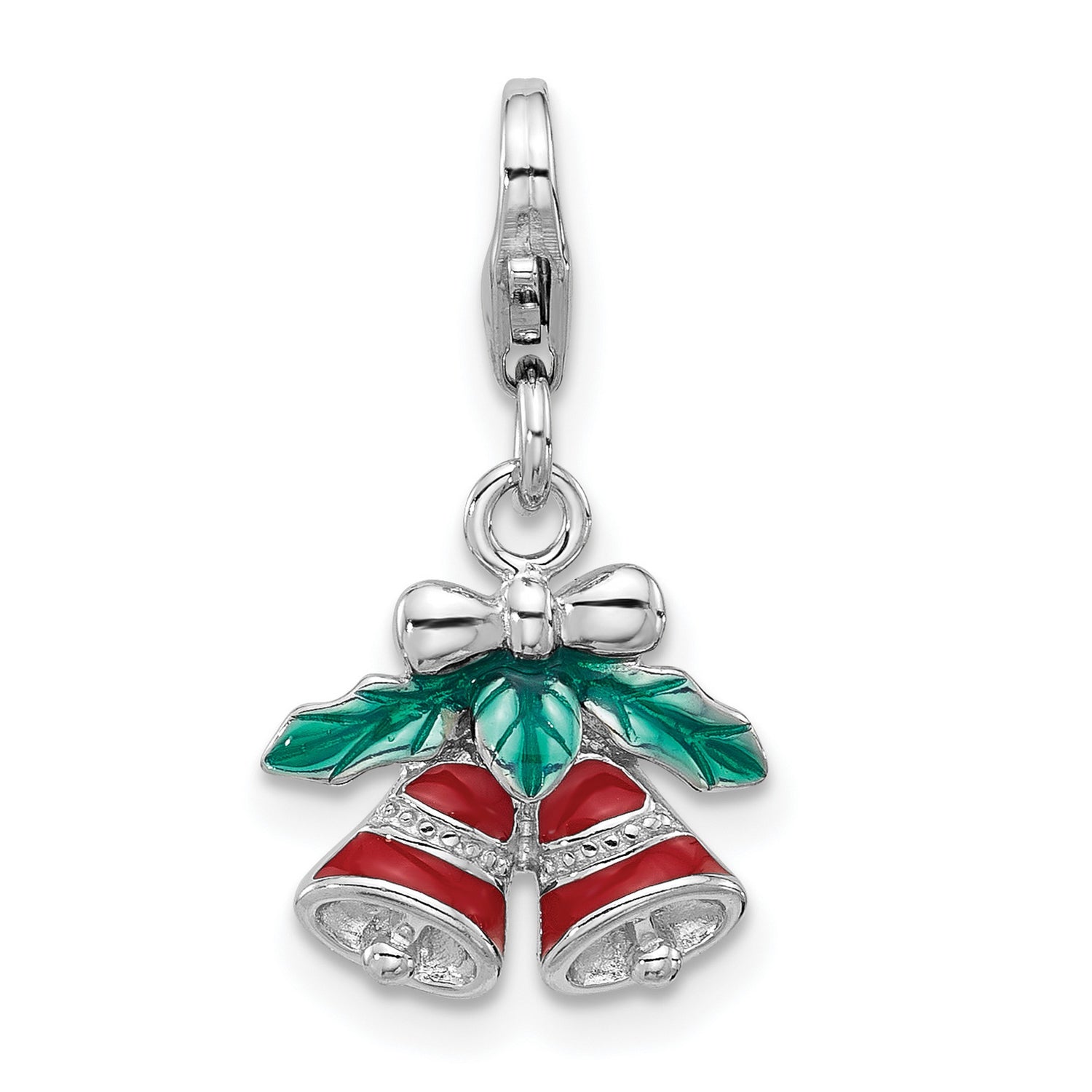 Sterling Silver Christmas Bell Charm with Red Enamel, Holly Leaves, Bow, Lobster Clasp