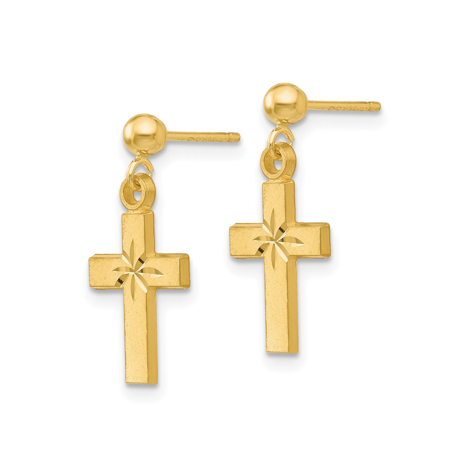 14k Yellow Gold Cross Drop Earrings with Diamond Cut Detail and Satin Finish for Men and Women