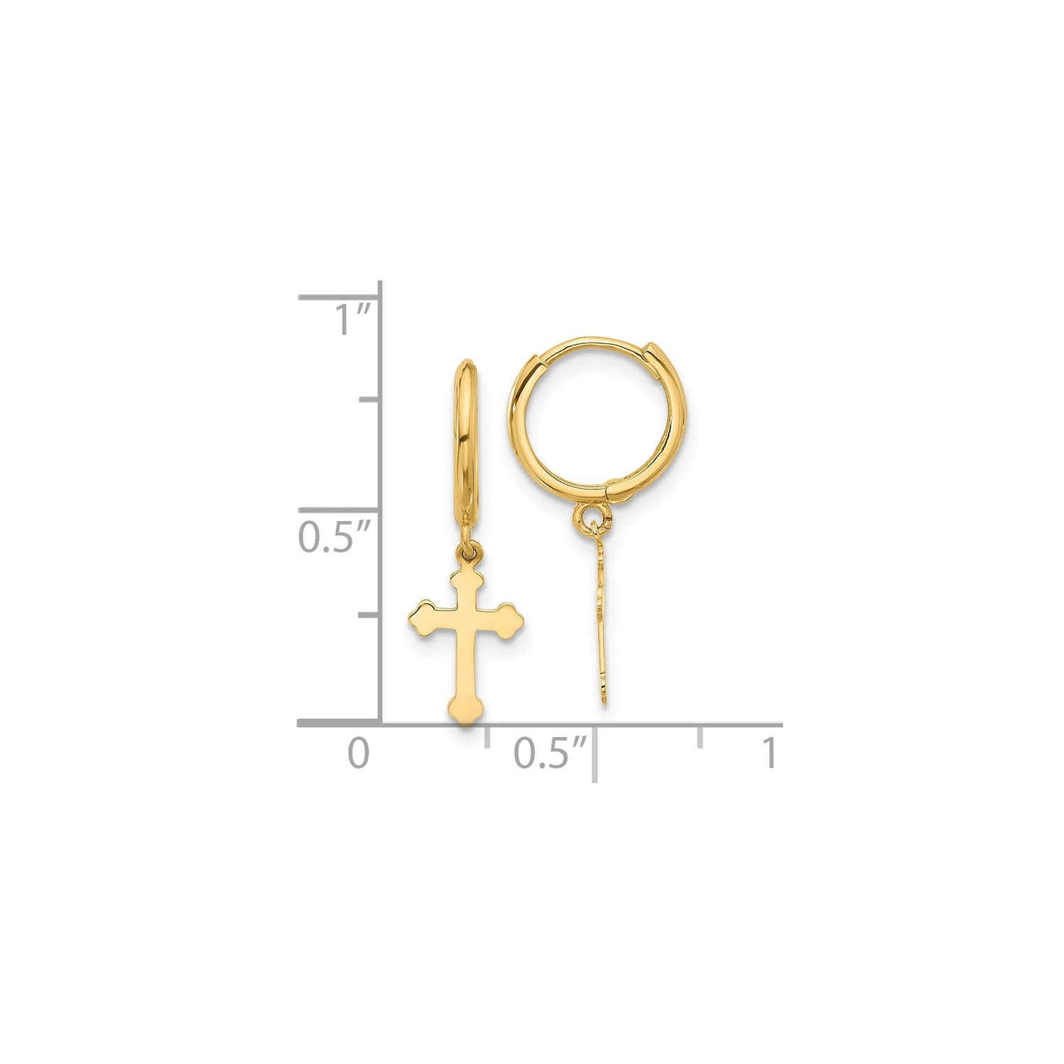 14k Yellow Gold Hoop Earrings with Decorative Cross Charm, Christian Religious Dangle Style