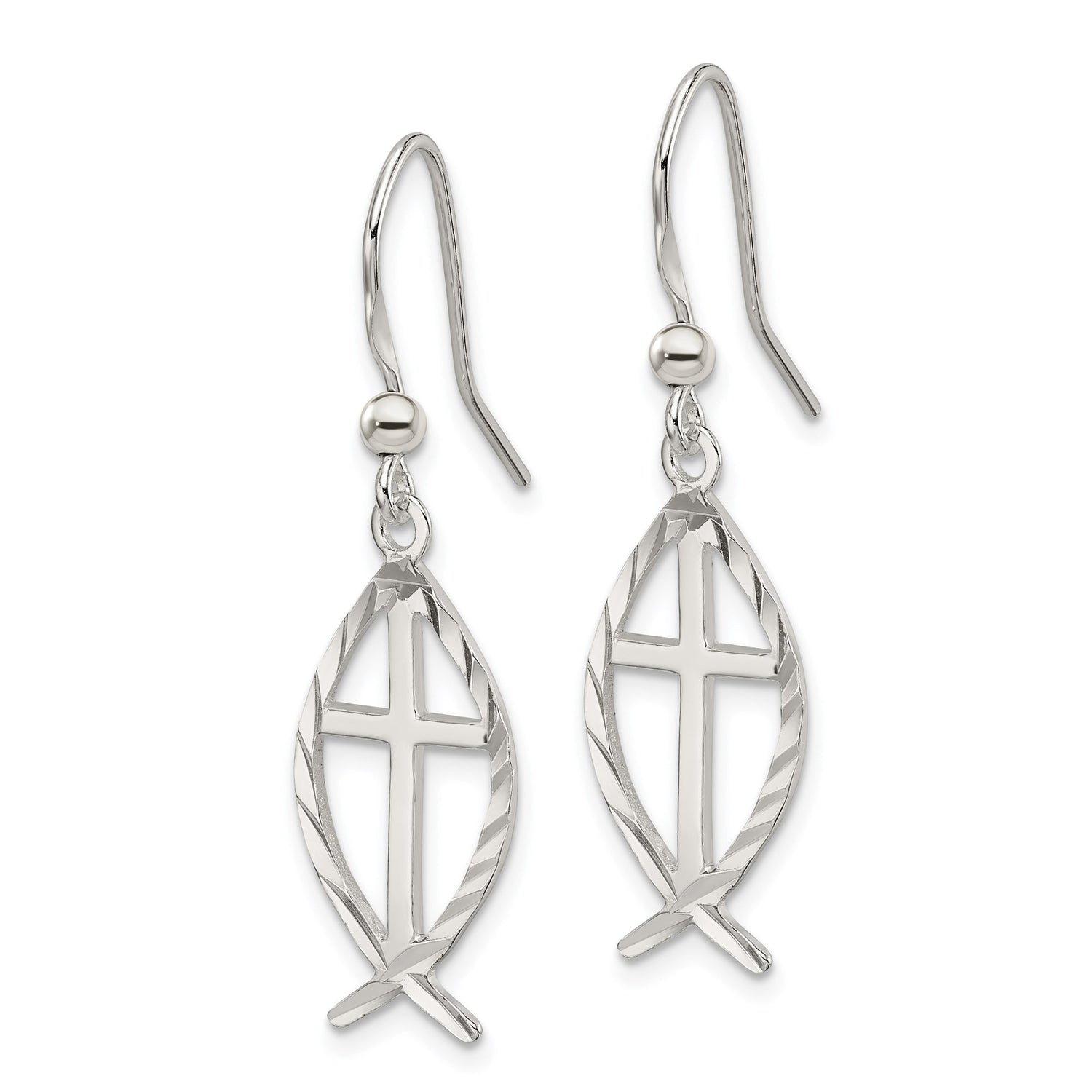 Sterling Silver Cross Pendant with Ichthus Symbol, Polished Diamond-Cut Design