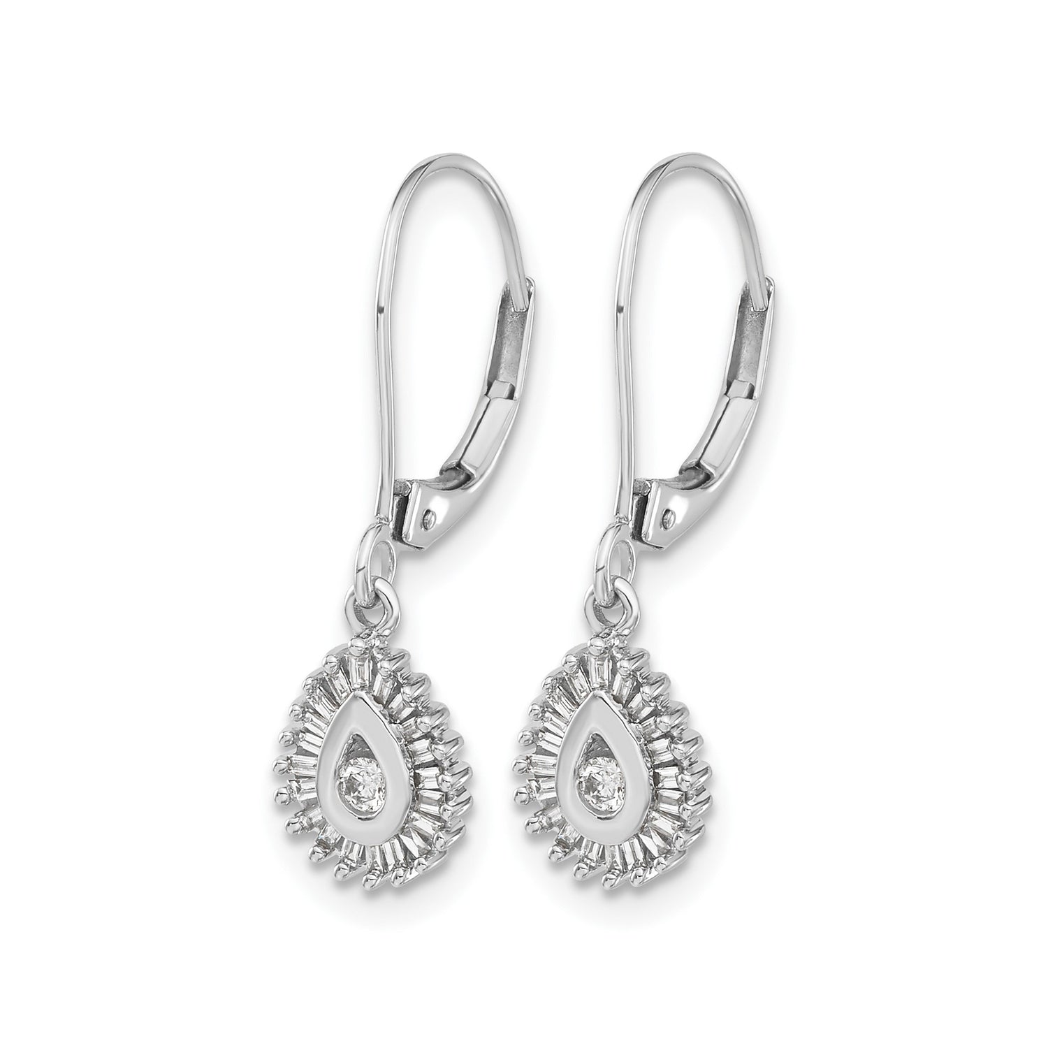 10k White Gold Teardrop Dangle Earrings with Diamond Accent and Baguette Halo Design