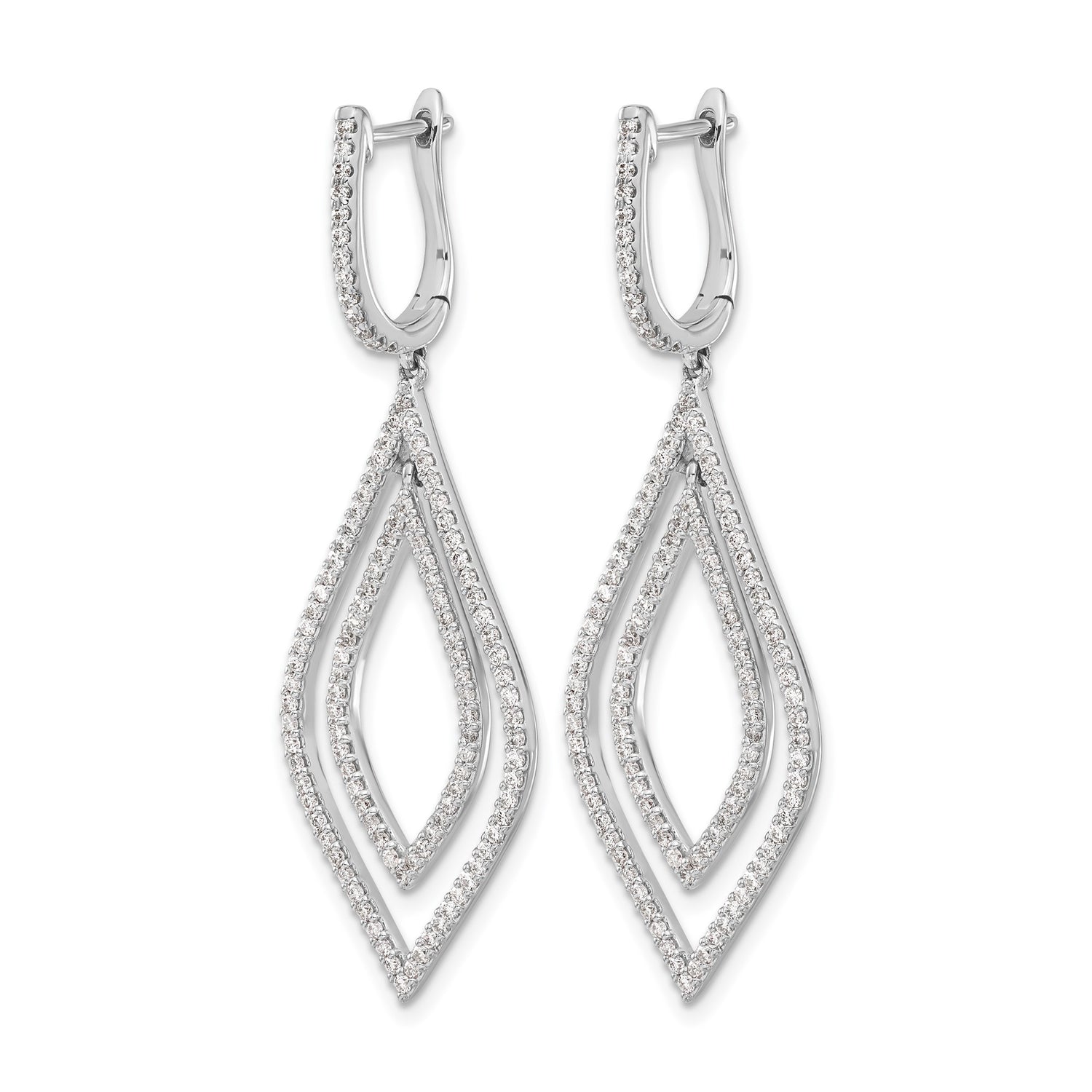 Fall in love with refined artistry and modern brilliance in these 14k white gold earrings, where every detail is designed to impress. With large marquise shaped drops perfectly sculpted in open form, these long earrings highlight delicate gold drops in a sleek silhouette that exudes timeless sophistication. Round cut white diamonds are carefully set to shimmer with each move, offering captivating sparkle without overwhelming the elegant composition. Slip them on with a flowing gown or tailored evening ensemble and experience a true statement of luxury design.