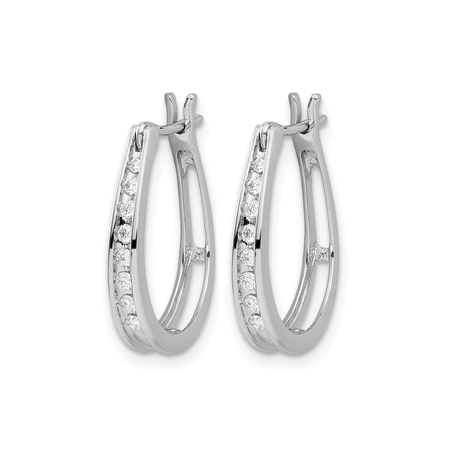 Crafted from shiny 14k white gold, the secure oval hinged hoop earrings provide comfort and durability, making them a staple among luxury earrings for women. The simplicity of the channel set hoops highlights the impact of clean lines and radiant stones. Every detail showcases a harmonious combination of polished gold finish, subtle design, and fine diamond hoops quality.