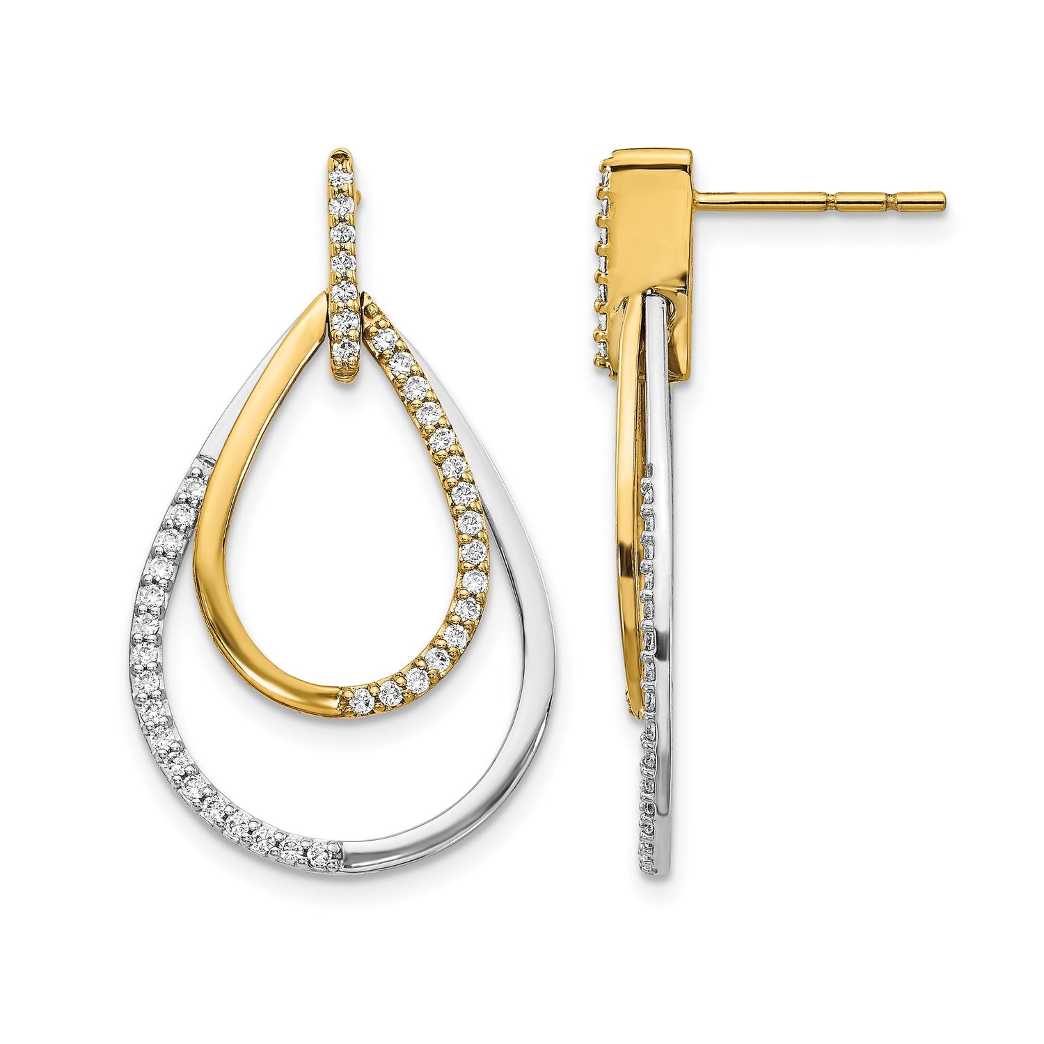 Crafted to embody both timeless elegance and modern beauty, these 14k two tone earrings are a luxurious addition to women's fashion jewelry collections. Each pair features a unique combination of yellow and white gold that gracefully intertwines to create a sophisticated teardrop shape. The interplay of polished gold and sparkling cubic zirconia adds a radiant element to every movement, making these formal event earrings ideal for elevating your look with quiet brilliance.