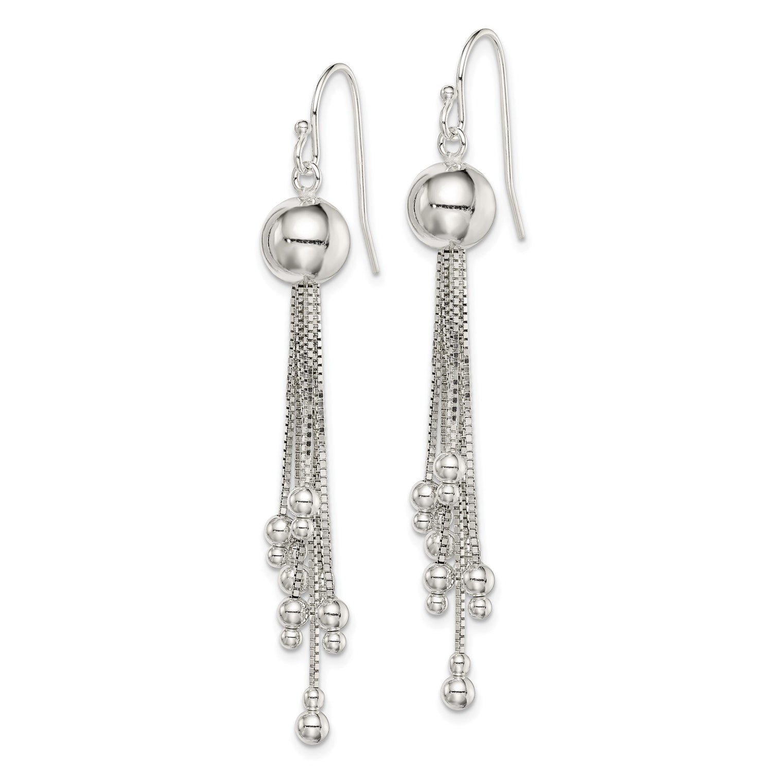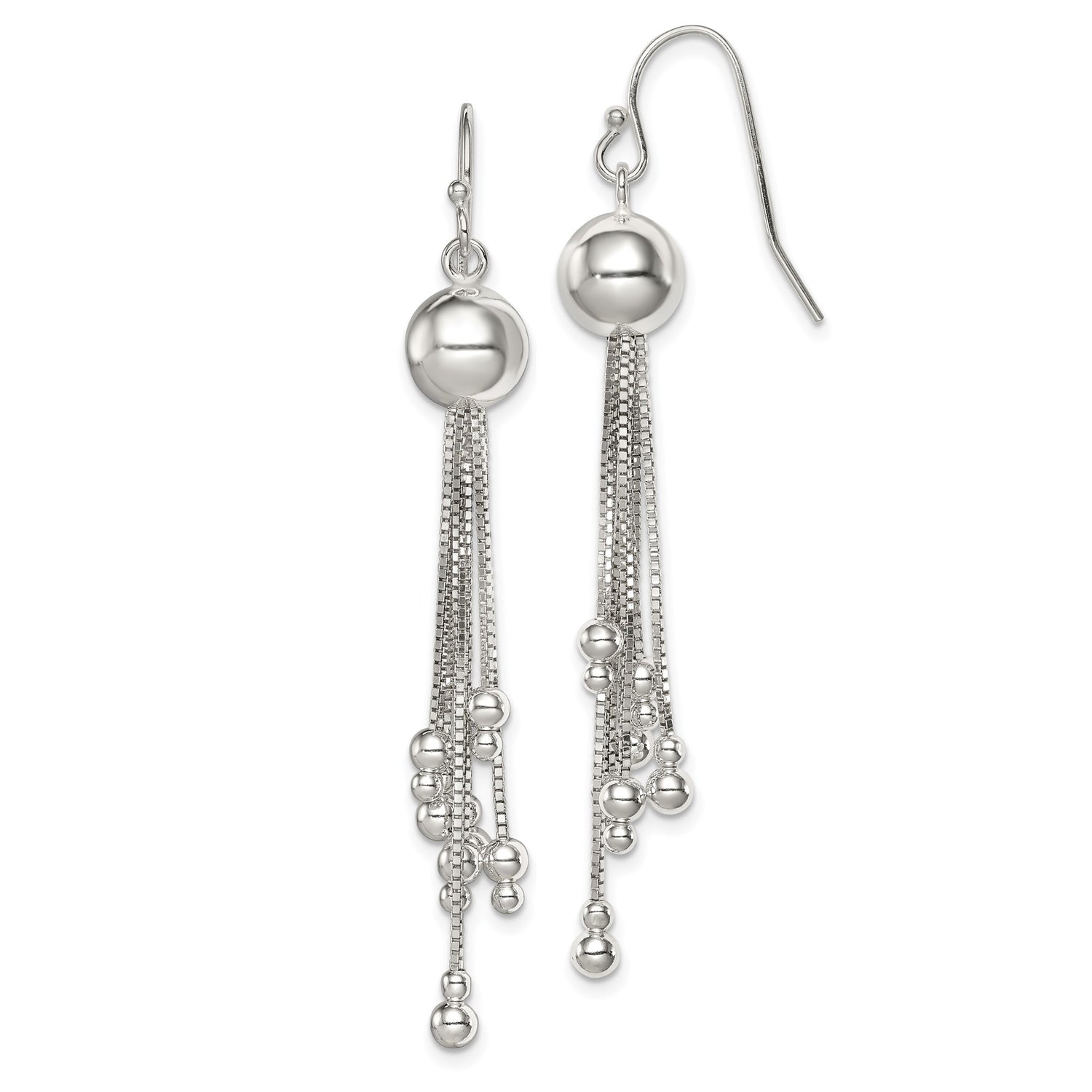 Sterling Silver Dangle Earrings with Polished Round Beads and Cascading Box Chains