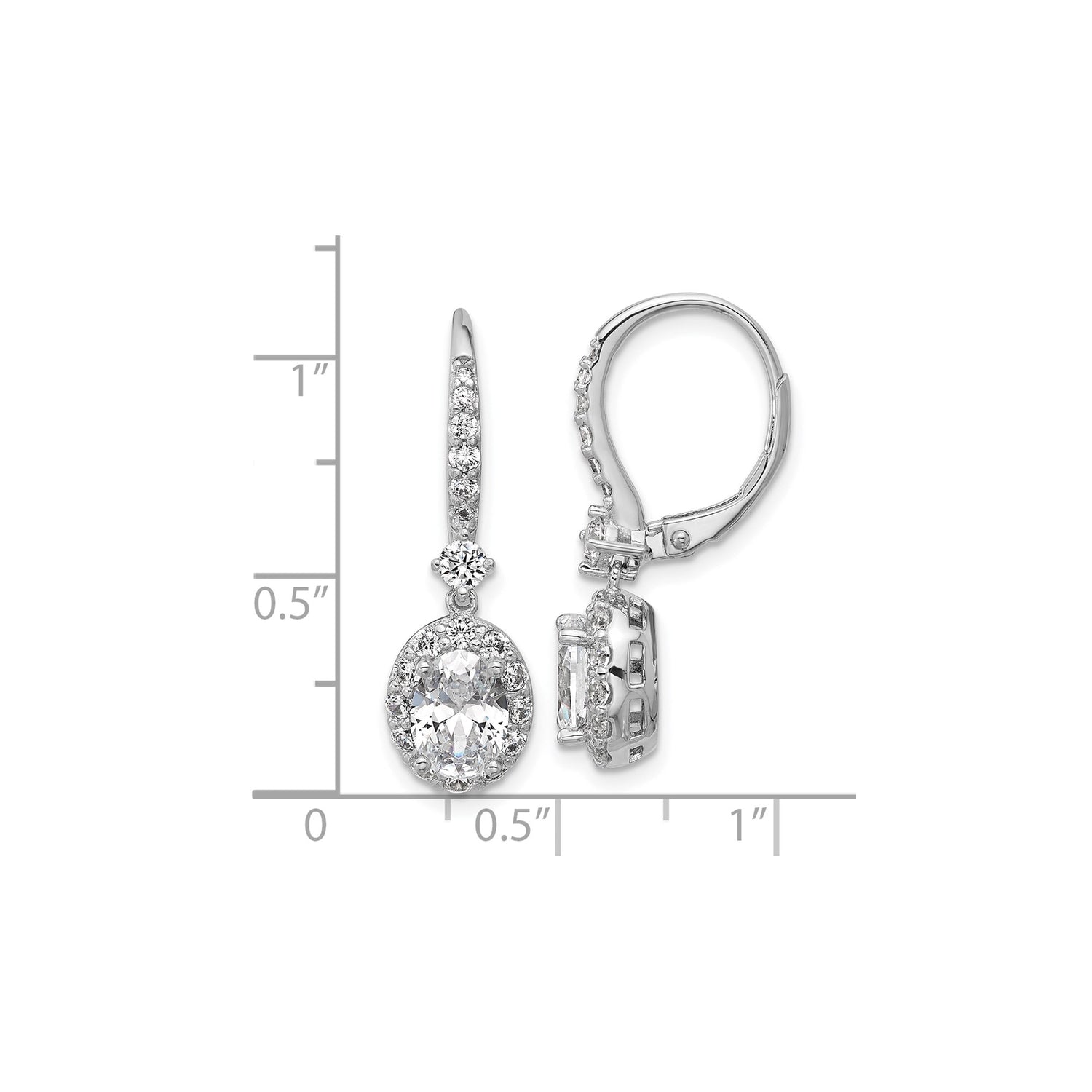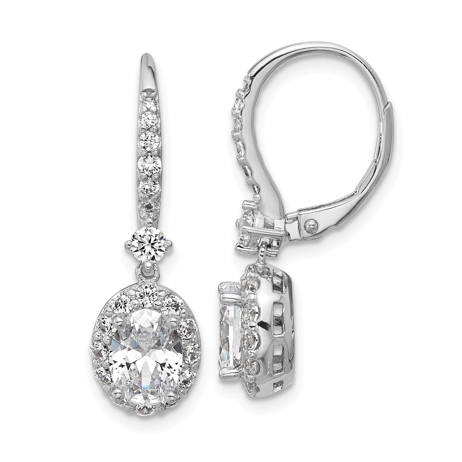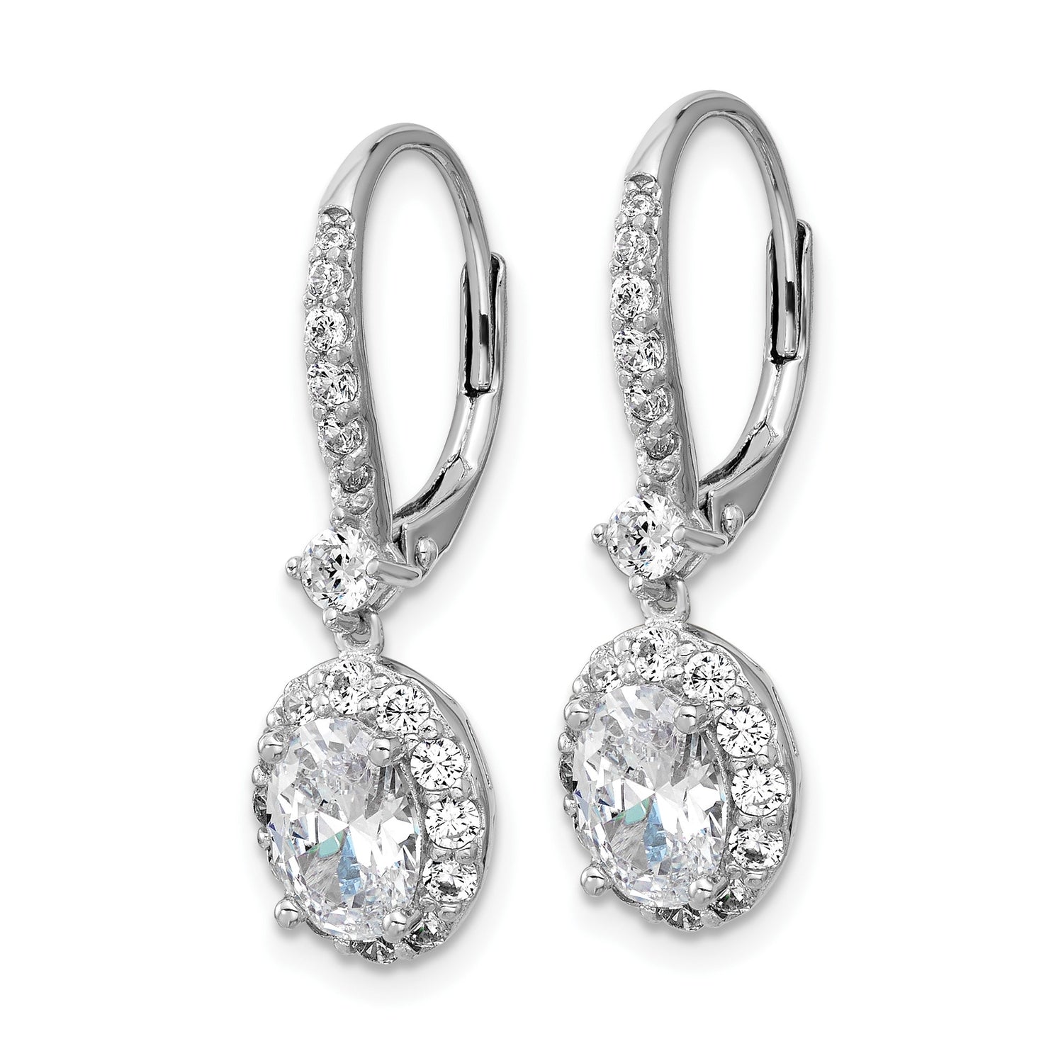 Sterling Silver Drop Earrings with Oval Cut Cubic Zirconia and Halo Leverback Design