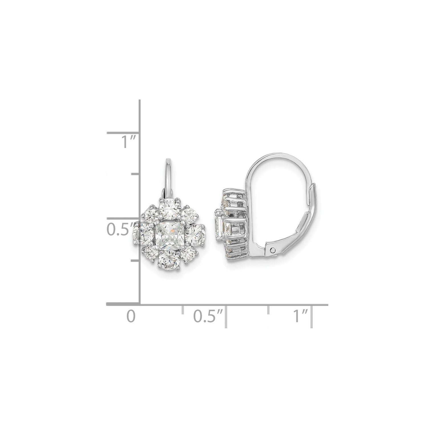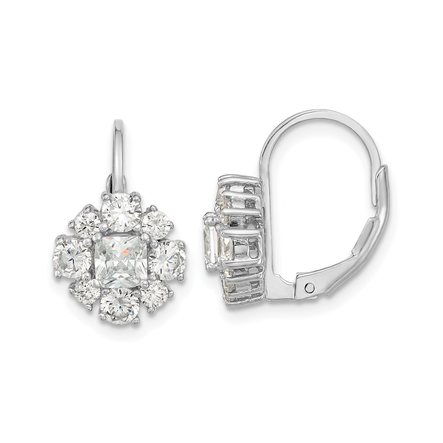 Sterling Silver Leverback Earrings with Princess Cut Cubic Zirconia Floral Cluster Design