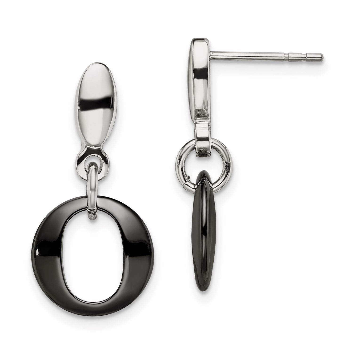 Stainless Steel Drop Earrings with Black Enamel, Oval Open Hoops, Modern Geometric Style