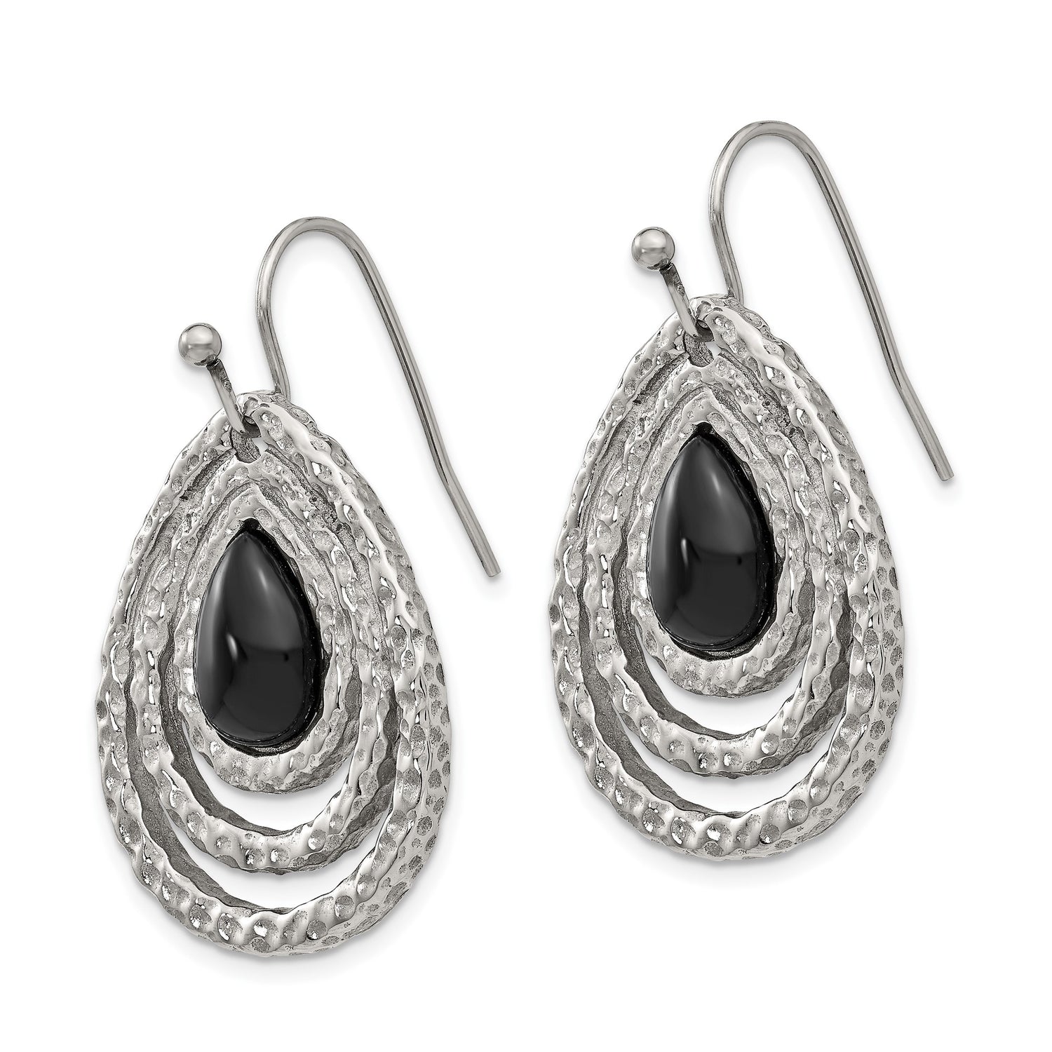 Stainless Steel Teardrop Dangle Earrings with Onyx and Hammered Texture, Layered Open Design