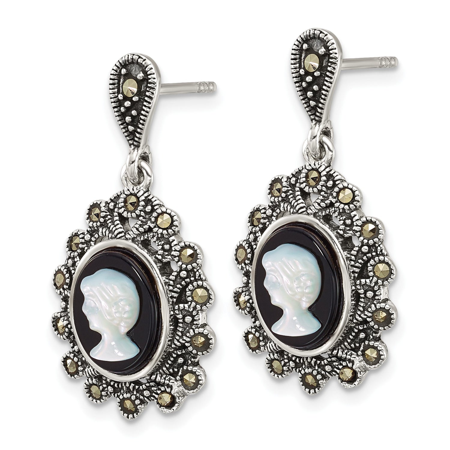 Sterling Silver Cameo Drop Earrings with Black Agate, Mother of Pearl, and Marcasite Accents