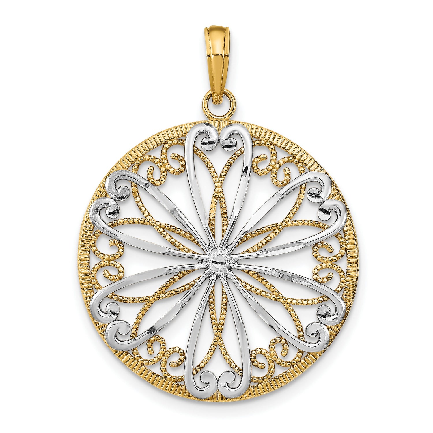 14k Multi-Tone Gold Round Filigree Pendant with Floral Scroll Design, Christian Medallion