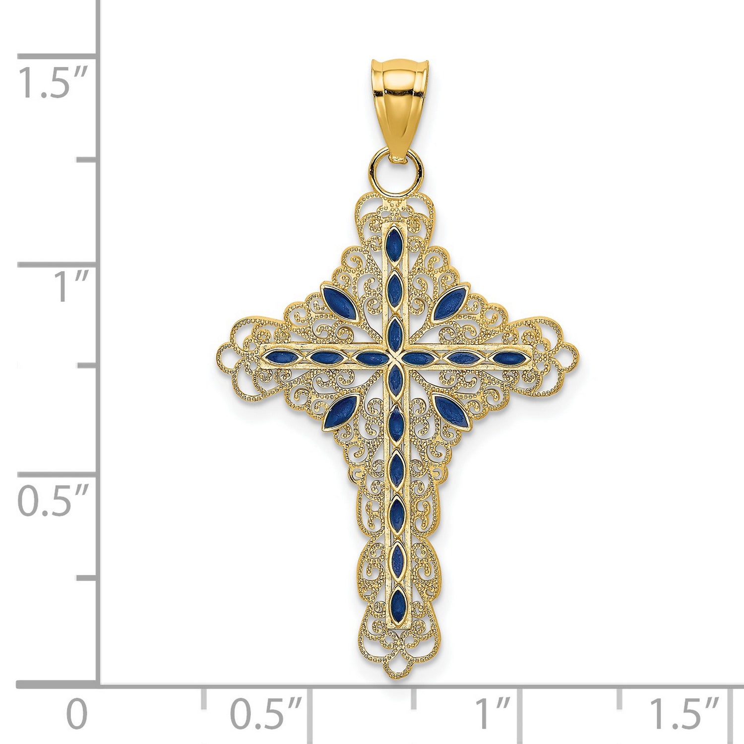 Discover the exquisite craftsmanship of the Blue Enamel Filigree Cross Charm Pendant in Real 14k Yellow Gold. This elegant piece is a harmonious blend of traditional symbolism and modern design, making it a perfect accessory for any occasion.