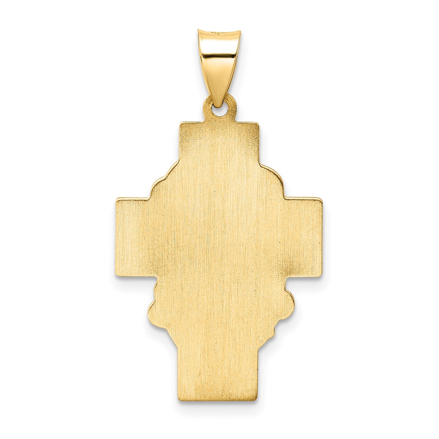 Introducing the exquisite Polished and Satin Hollow Jesus Face Cross Charm Pendant crafted in real 14k yellow gold. This pendant is a perfect blend of spirituality and elegance, making it an ideal addition to your jewelry collection or a meaningful gift for a loved one.