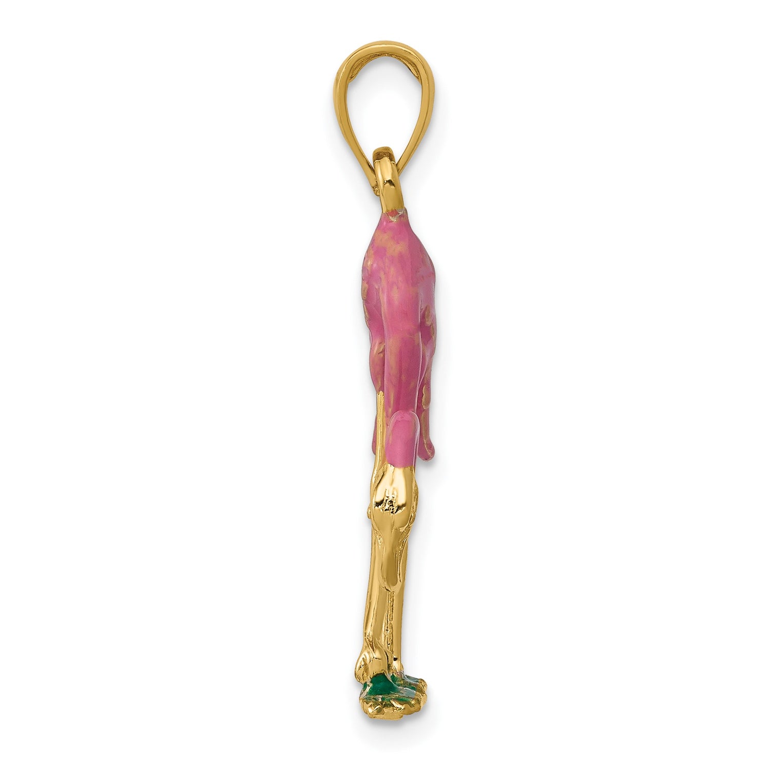 14k Yellow Gold Flamingo Pendant with Pink and Green Enamel, Tropical Bird Charm for Women
