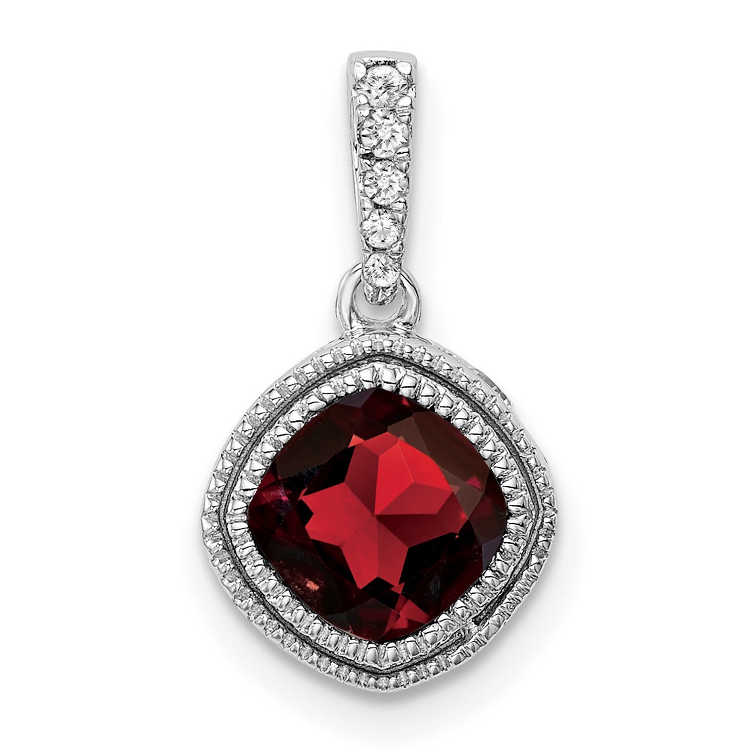 Cushion Garnet and Diamond Charm Pendant in Real 14k White Gold