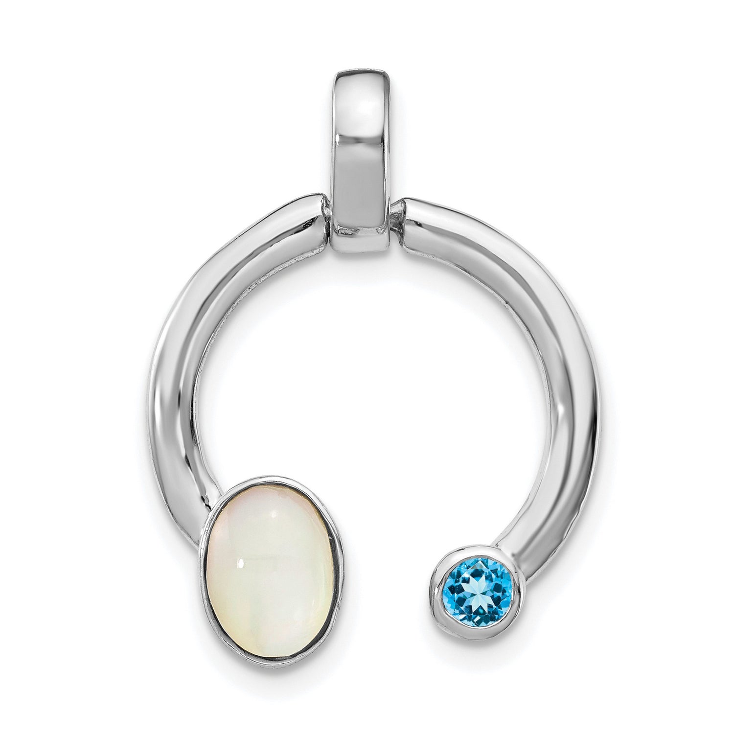 This pendant is more than just a piece of jewelry. It's a versatile accessory that can elevate your everyday look or add a touch of elegance to your evening attire. The combination of Mother of Pearl and Swiss Blue Topaz creates a captivating contrast that's sure to attract compliments.