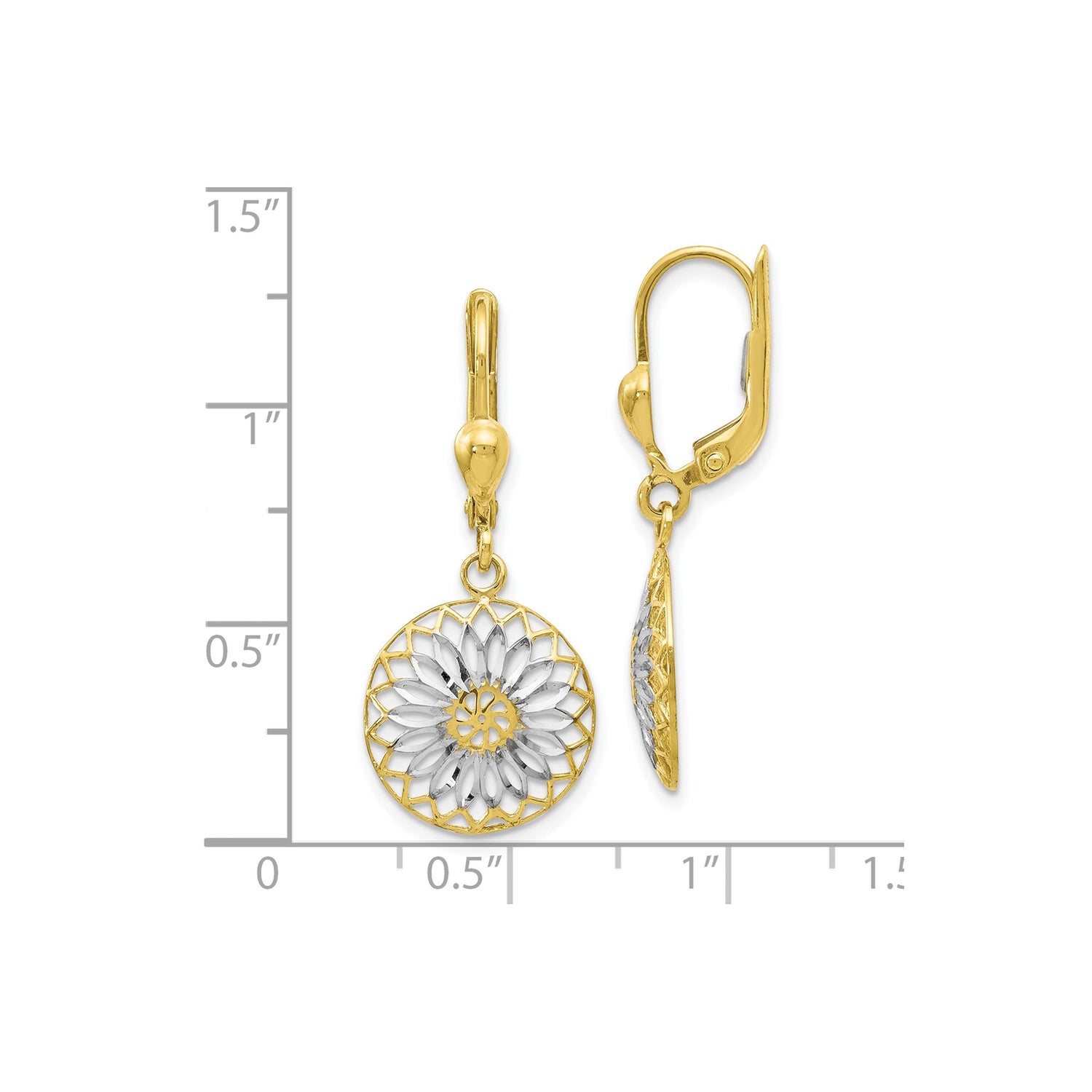10k Yellow Gold Leverback Earrings, Mandala Flower Dangle, Rhodium Finish, Boho Nature-Inspired Style