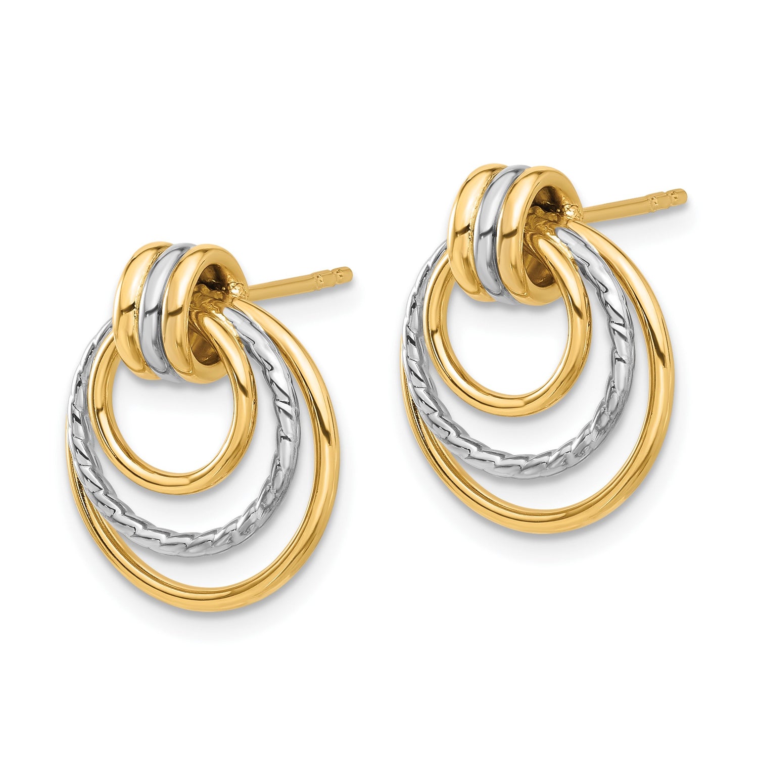 With a modern interlocking circle design and the brilliance of white and yellow gold, these 14k two-tone gold earrings present a refined take on timeless style. The layered textured gold hoops create a dynamic visual effect, combining a minimalist silhouette with textured detail for added depth and dimension. These elegant drop circle earrings offer a polished look that transitions effortlessly from day to night, blending modern aesthetics with versatile elegance. Delicate yet bold, these gold dangle hoop earrings are expertly crafted for those who appreciate symbolic design jewelry. The interlocking gold hoops represent harmony and balance, while the two-tone gold creates visual interest perfect for expressing personal style. Designed to be worn comfortably, the lightweight drop hoop earrings are easy for daily wear and ideal for adding understated sophistication to any wardrobe. Experience the freedom of balanced style through these contemporary gold dangle earrings. The fine two-tone dangle earrings feature stylish textured gold hoops that accentuate your natural confidence. Whether worn with casual attire or dressed up for an evening out, these modern earrings reflect refined taste and individuality. The 14k earrings feature secure post earrings for a reliable fit, making them classic yet fashion-forward gold hoop earrings. Add these fashion gold hoop earrings to your collection and embrace the beauty of modern gold jewelry that reflects your sense of self. From fashion-forward gold hoop earrings to minimalist two-tone hoop earrings, they offer a unique fusion of elegance and charm in every detail.