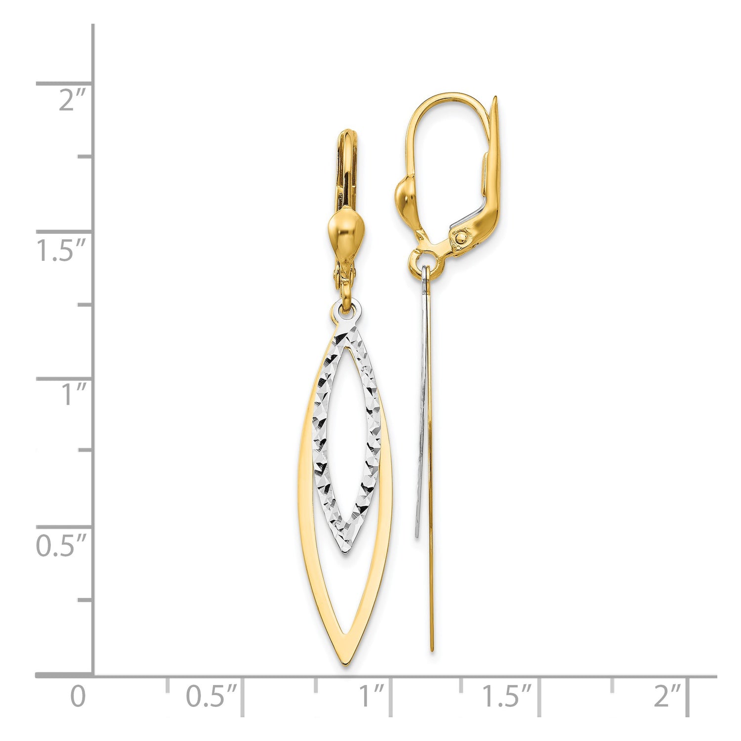 These 14k gold earrings exemplify the graceful elegance of marquise style earrings while embracing the contemporary feel of fashion jewelry. The gold textured leverback earrings design combines yellow and white elements for a vibrant contrast that enhances your ensemble. From boardroom meetings to special gatherings, these ladies formal gold earrings provide an instant statement of taste. Complete your accessories collection with these fashionable and sophisticated gold earrings that merge artistry and wearable luxury in one timeless pair.