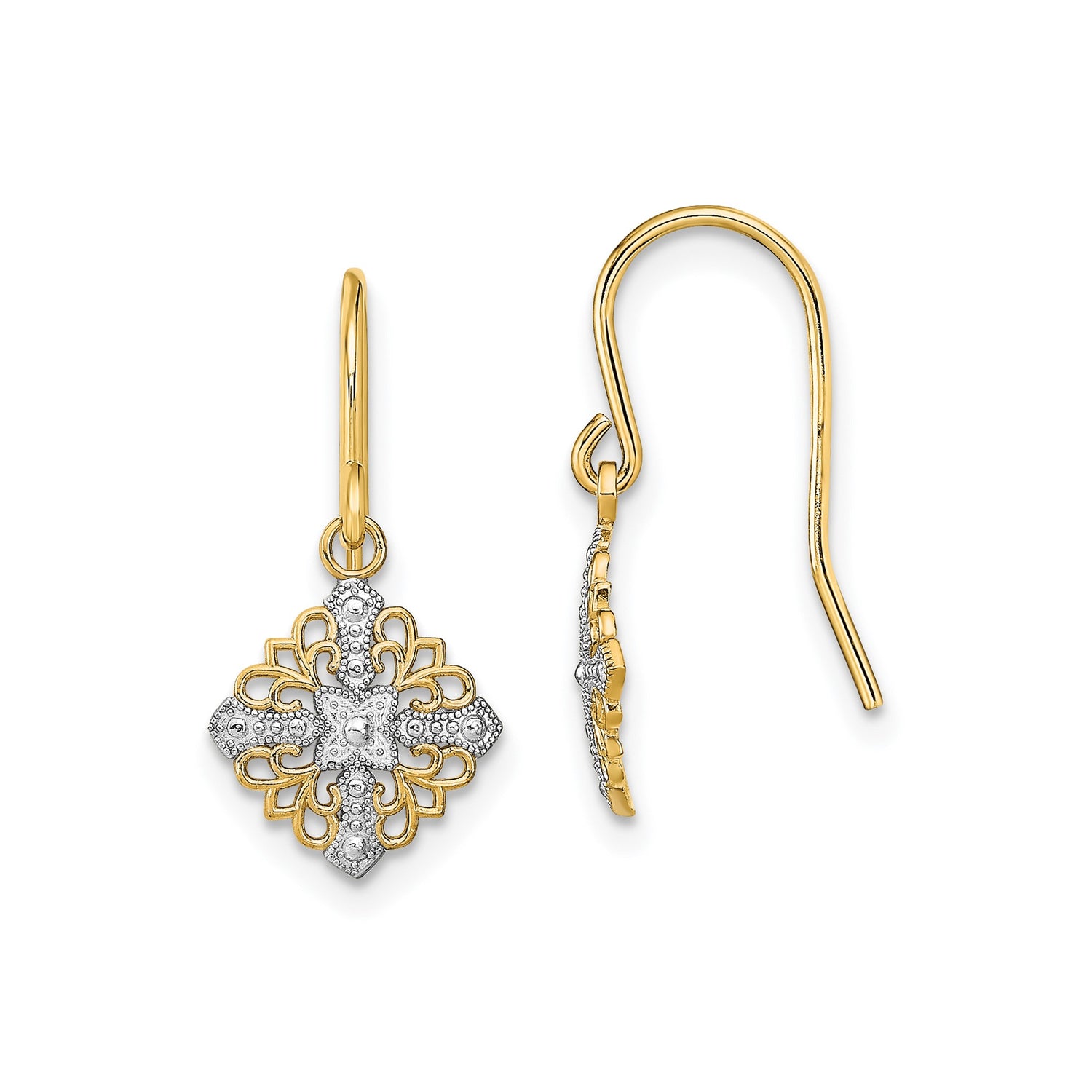 Elevate Your Ensemble With These Ornate Dangle Cross Earrings That Perfectly Merge Symbolism And Style. Crafted In Luxurious 14k Yellow Gold With Rhodium Accents, These Spiritual Earrings Showcase A Decorative Faith Cross In An Intricately Designed Filigree Motif. The Fleur-De-Lis Dangle Earrings Add A Historical Touch, Making Them An Ideal Choice For Those Drawn To Religious Fashion Style Earrings With Vintage Appeal.