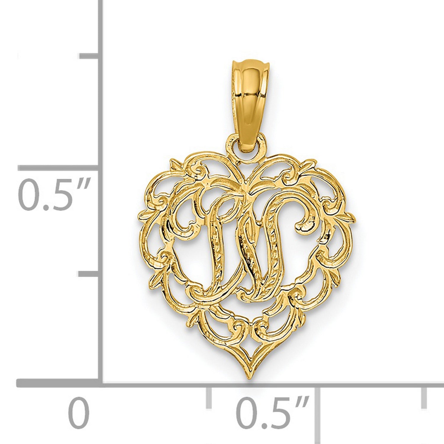 14k Yellow Gold Heart Pendant with Script M Monogram, Filigree Letter Charm for Women