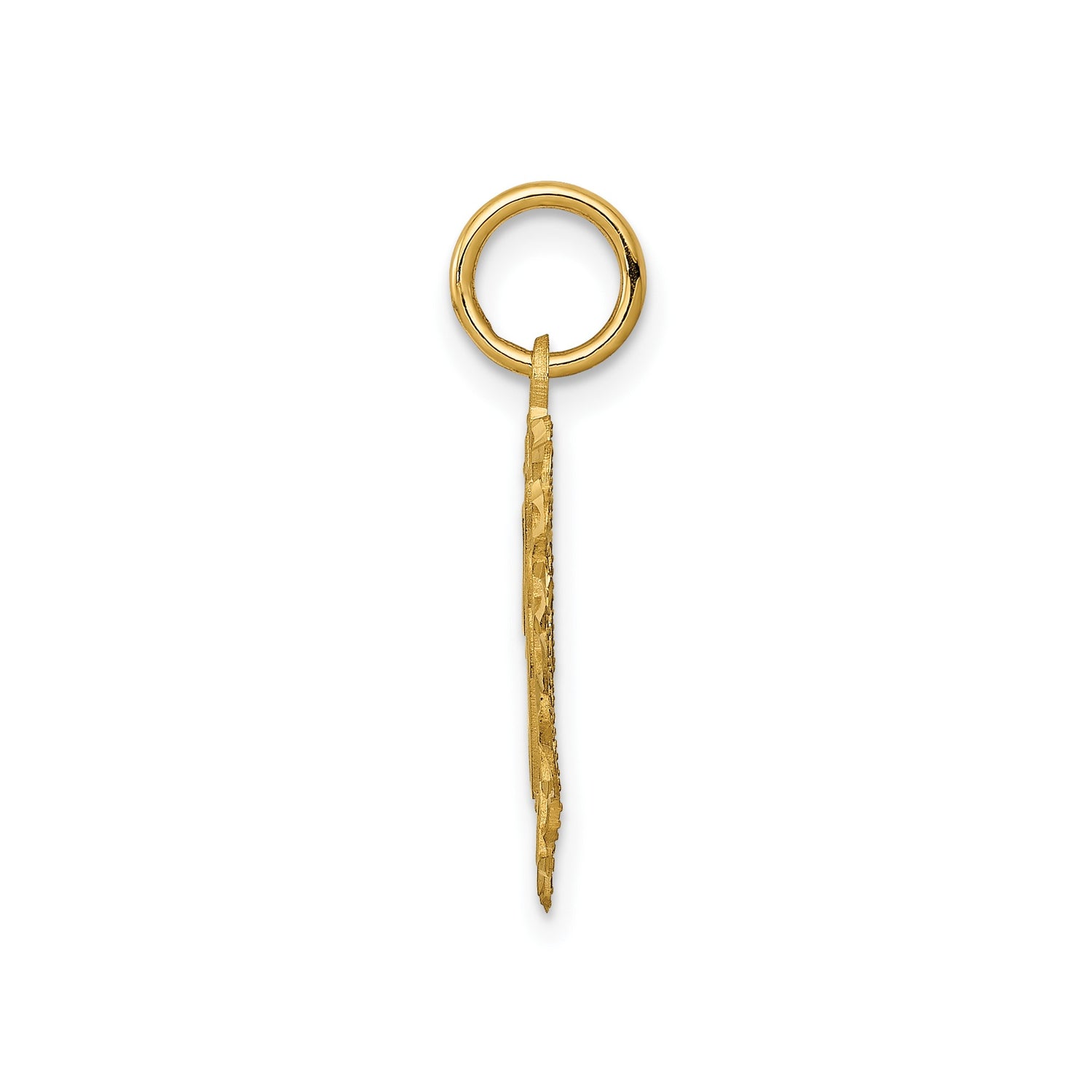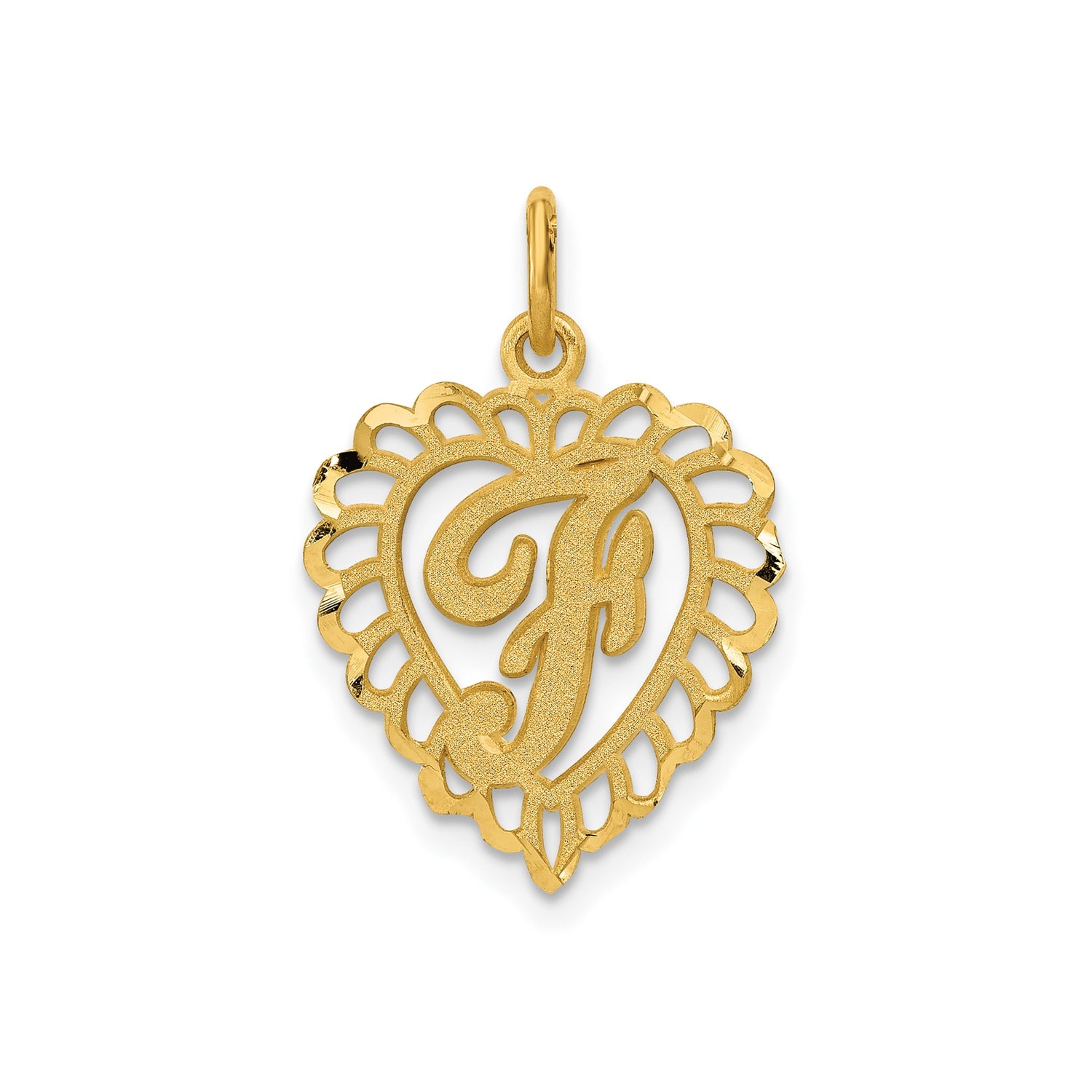 14k Yellow Gold Heart Pendant with Textured Script F Initial and Scalloped Filigree Border