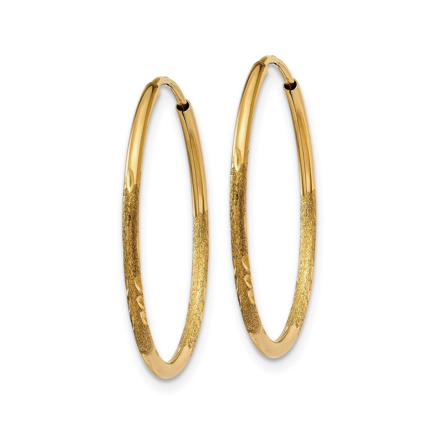 The Sparkle Detail Gold Hoops Feature Polished Yellow Gold That Reflects Light from Every Angle, While the Satin Finish Delivers a Soft Contrast to the Gleaming Diamond Cut Highlights. These No Clasp Endless Hoops Slide On Easily and Remain Secure All Day, Making Them Ideal for Daily Wear Gold Hoops Fans Who Prefer Both Ease and Style.