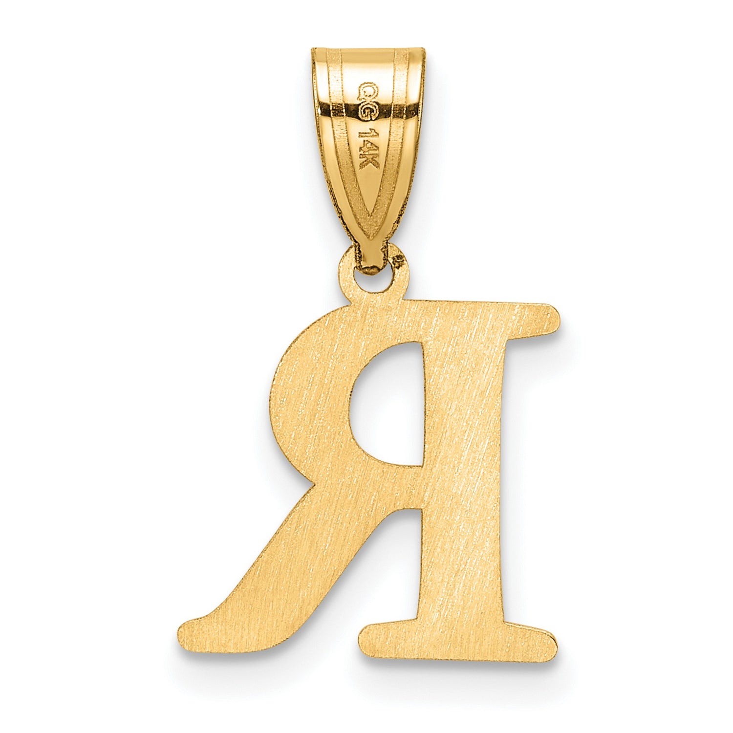 Discover elegance and sophistication with our Polished Etched Letter R Initial Charm Pendant, meticulously crafted in real 14k yellow gold. This exquisite piece of jewelry is perfect for those who cherish personalized adornments that make a statement.