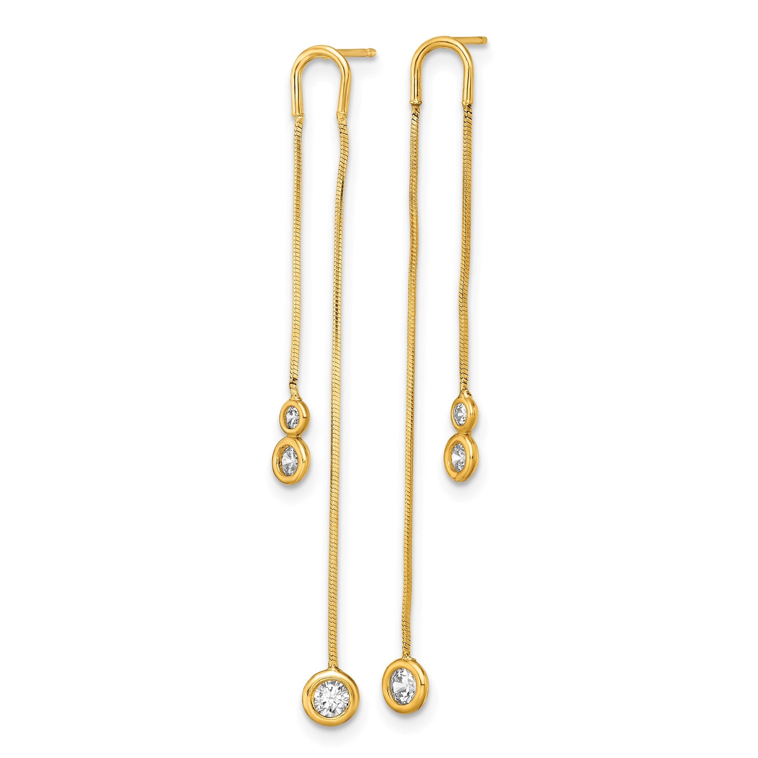 These Delicate Yellow Gold Threaders Are Accented with Bezel Set Cubic Zirconia That Captures and Reflects Light Beautifully. The Elegant Minimalist Earrings Incorporate the Best of Classic and Contemporary Styles, Featuring Modern Linear Drop Detail Combined with the Timeless Sparkle of Round CZ. Whether You're Drawn to Gold Dangle Earrings for Artistic Flair or Prefer Clean Simplicity, These Chain Threader Earrings Will Elevate Any Jewelry Look.