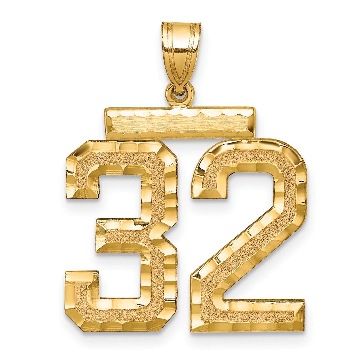 Large Brushed Diamond-cut Number 32 Charm Pendant in Real 14k Yellow Gold