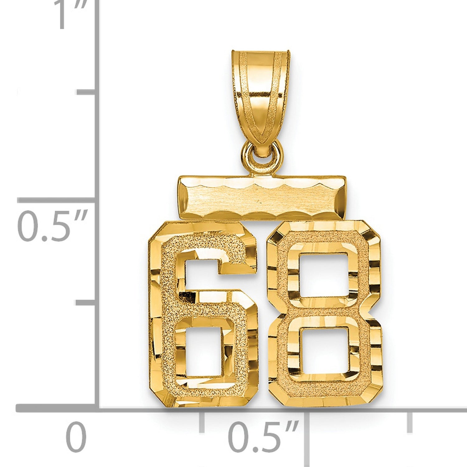 Enhance your collection with this stunning Small Brushed Diamond-cut Number 68 Charm Pendant in Real 14k Yellow Gold, and let its timeless beauty and meaningful design speak volumes in your jewelry ensemble.
