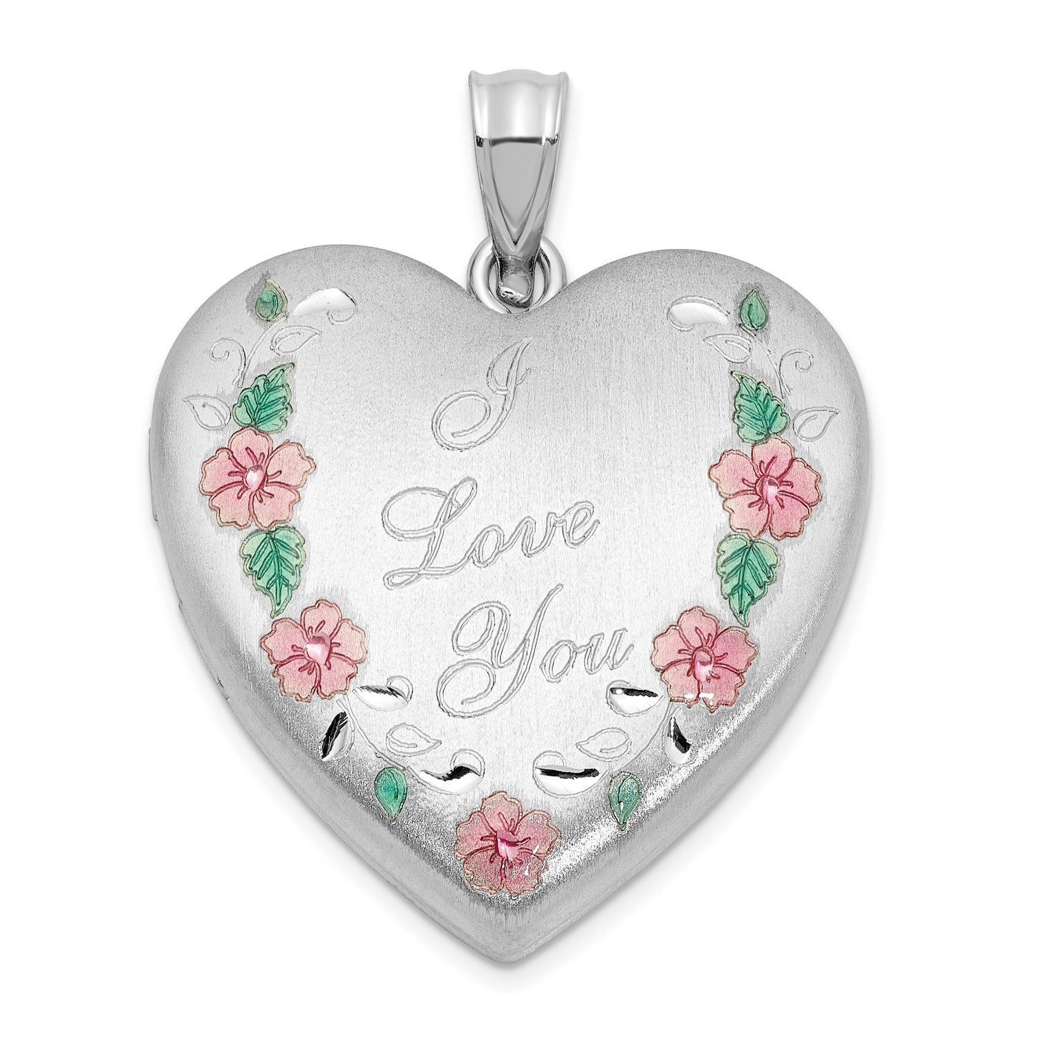 Sterling Silver Heart Locket Pendant with I Love You Engraving and Pink Floral Detail