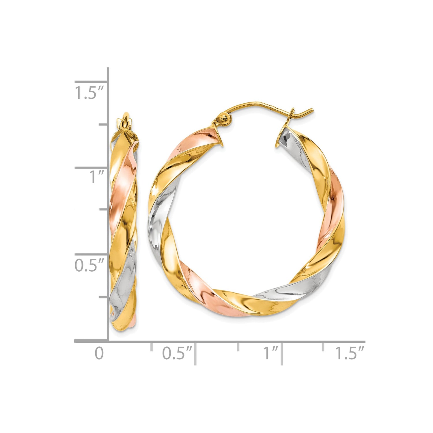 Carefully Crafted In 10k Gold, These Elegant Twist Hoops Showcase A High Polish Finish And A Refined Twist Design That Elevates Traditional Fashion Hoops. The Multi Tone Earrings Combine Comfort With Style, Allowing You To Enjoy Fashionable Tri-Color Twist Earrings Without Sacrificing Wearability. Add A Touch Of Chic To Your Look With These Ladies Twisted Hoops That Reflect Both Artful Craftsmanship And Modern Trends.