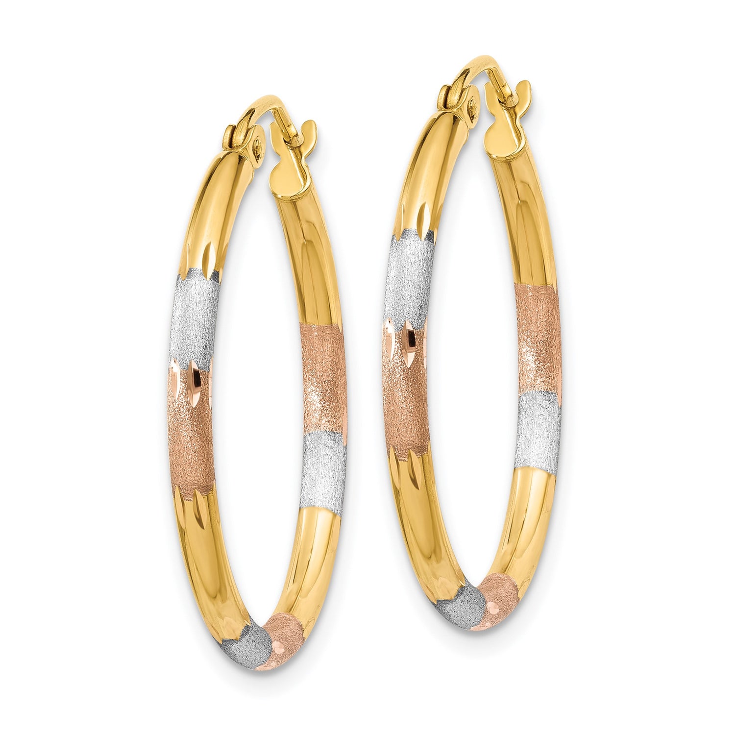 14k Tri-Color Gold Hoop Earrings, Polished and Textured Round Hoops, Latch Back Closure