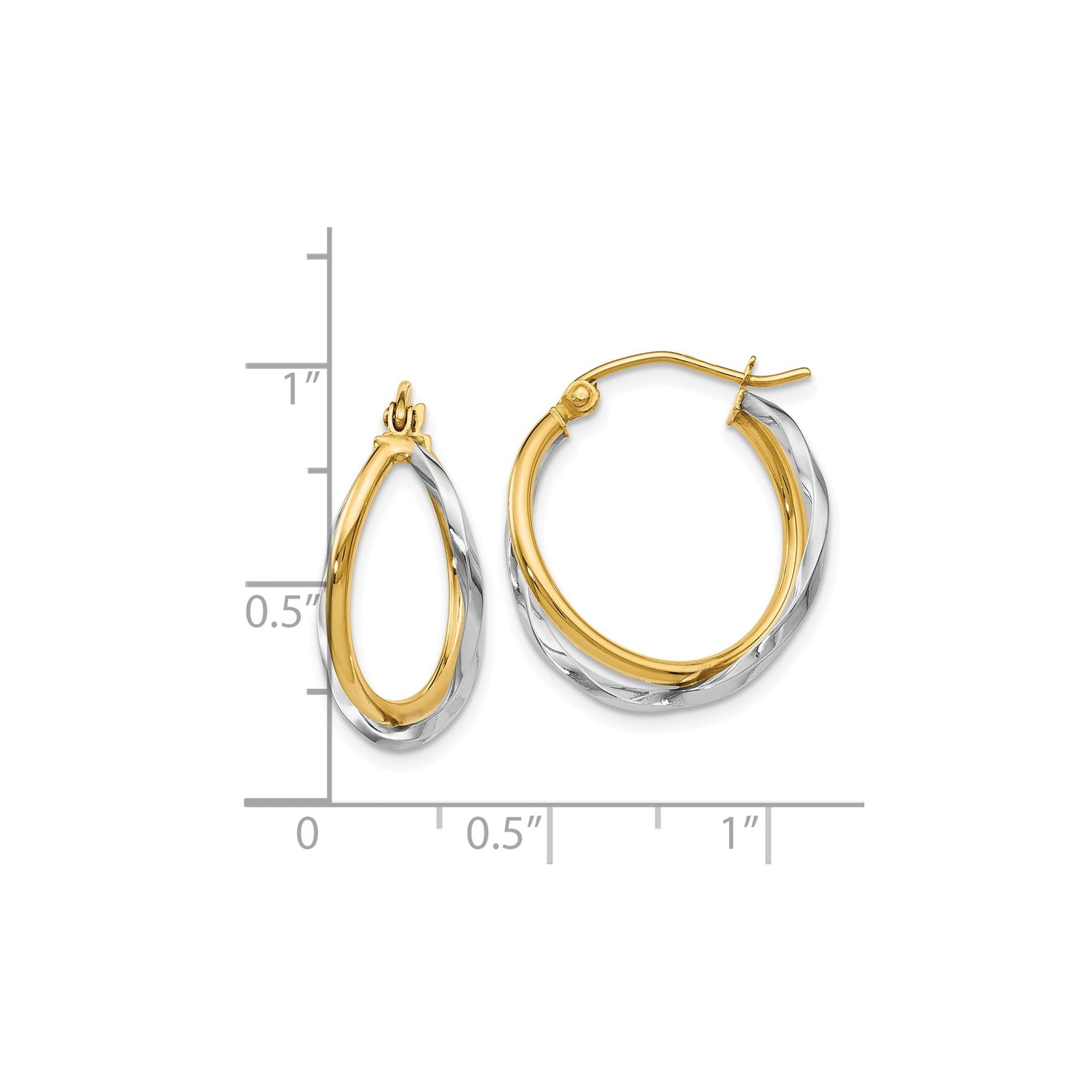 14k Two Tone Gold Twisted Hoop Earrings, Polished Yellow and White Oval-Round Design