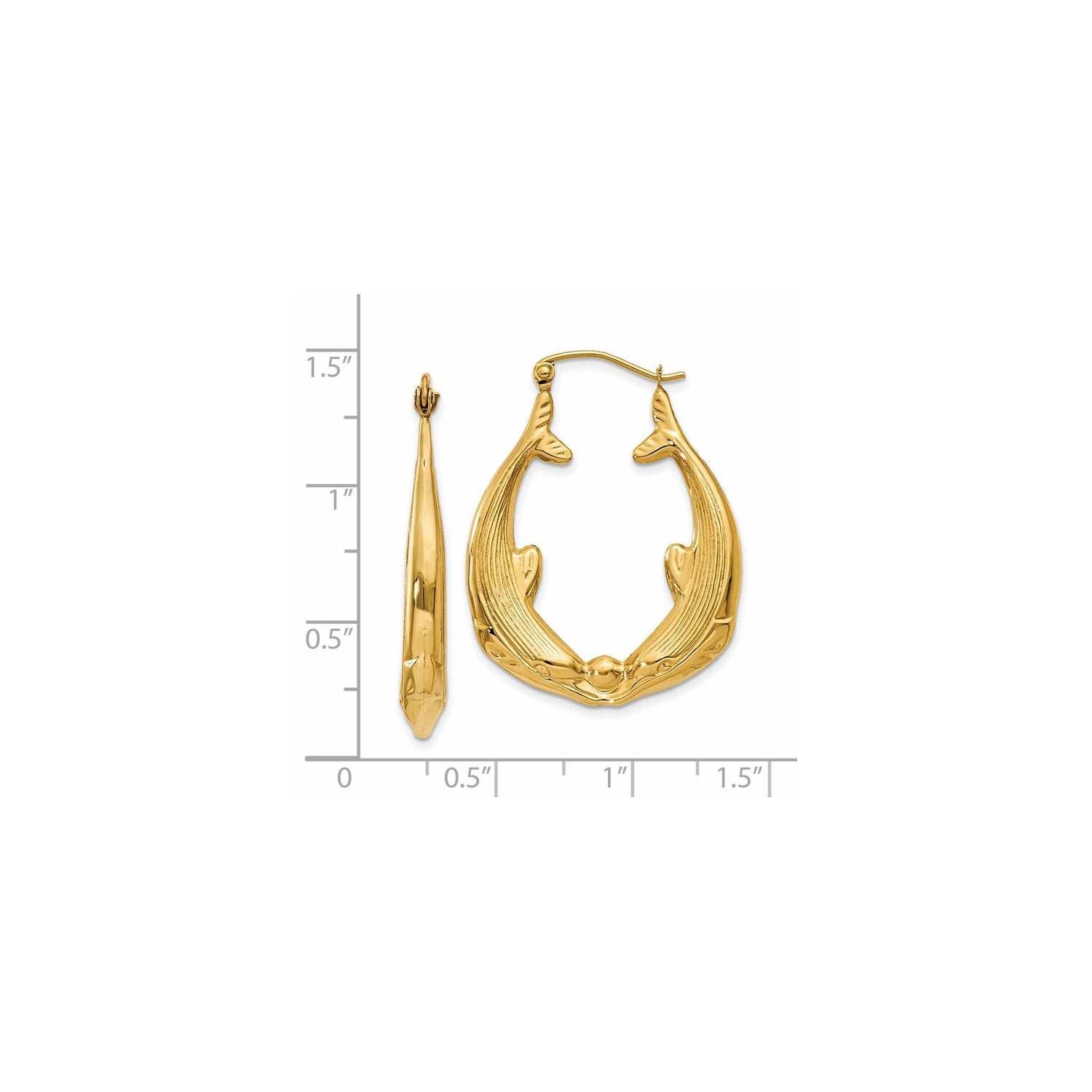 14k Yellow Gold Dolphin Hoop Earrings, Oval Shape with Textured Marine Motif