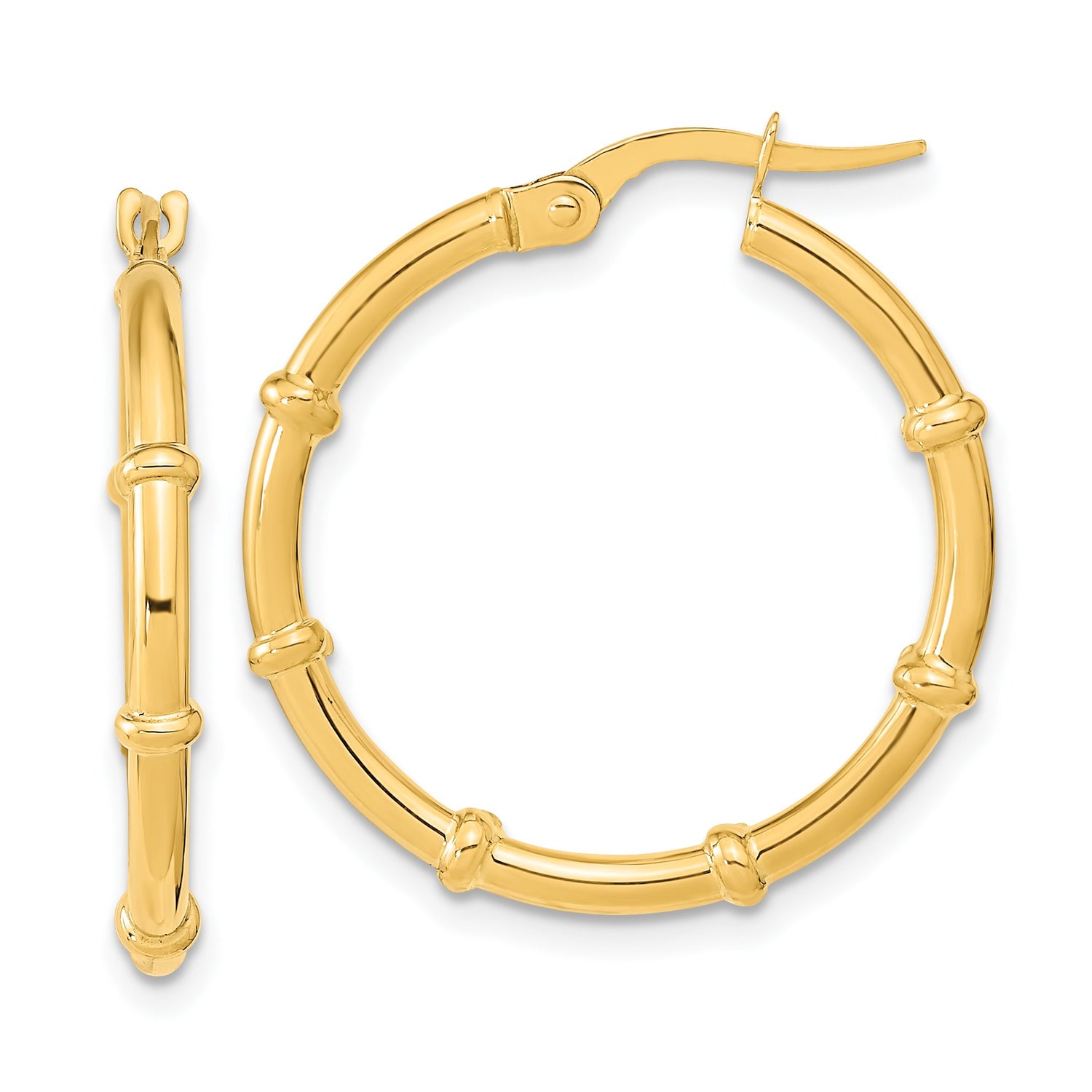 14k Yellow Gold Hoop Earrings, Bamboo Style with Polished Finish and Segment Ridges