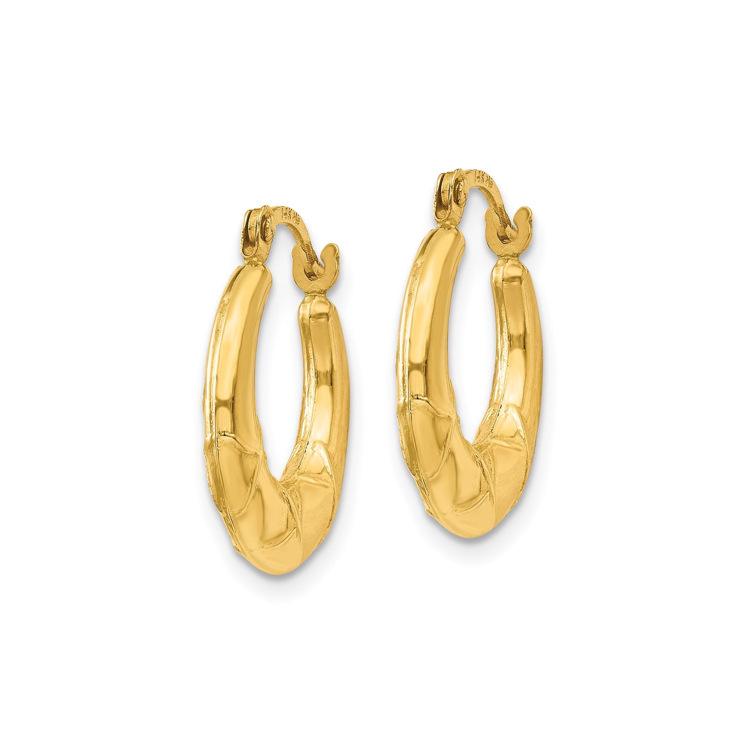 14k Yellow Gold Hoop Earrings, Puffed Textured Design with Subtle Cross Detail for Women