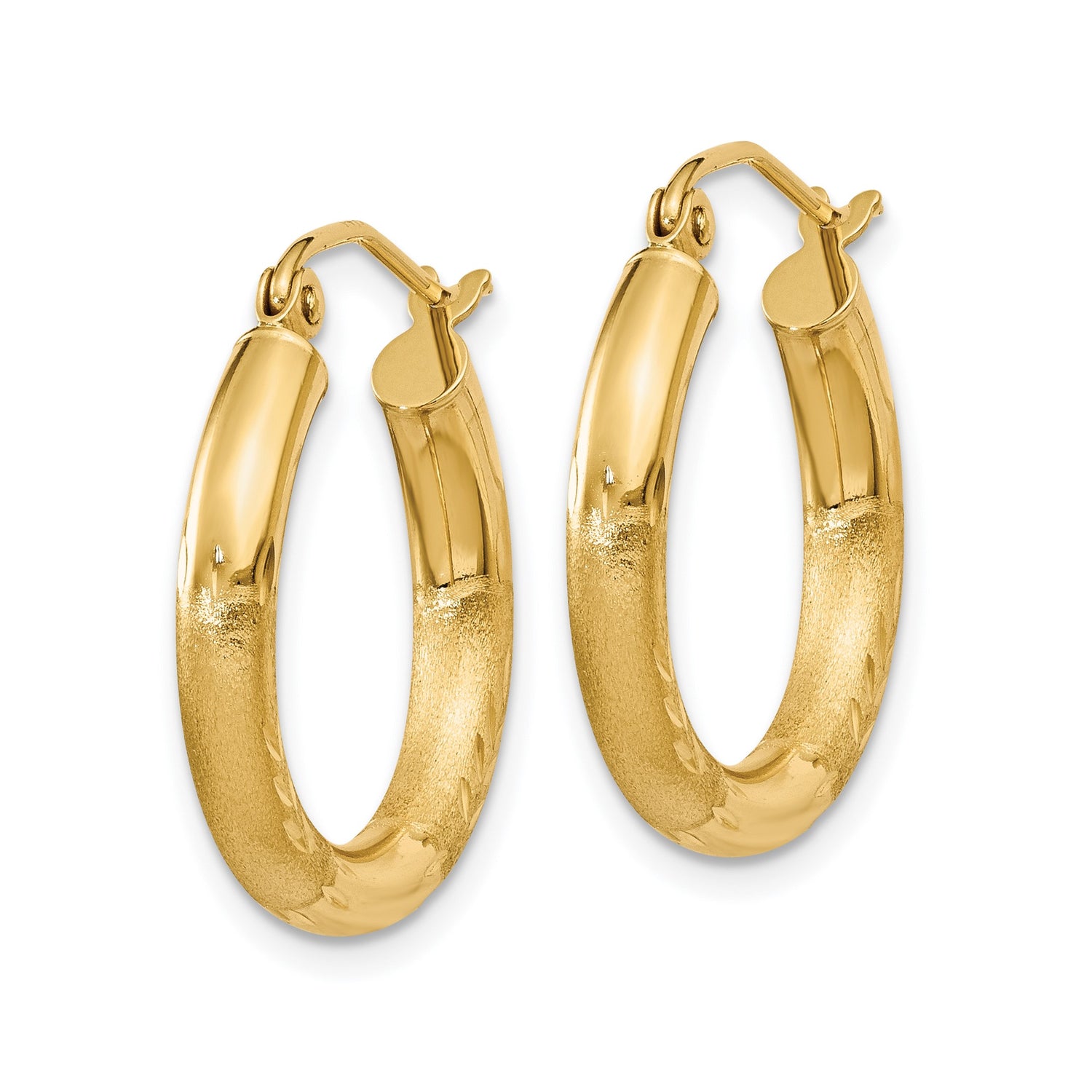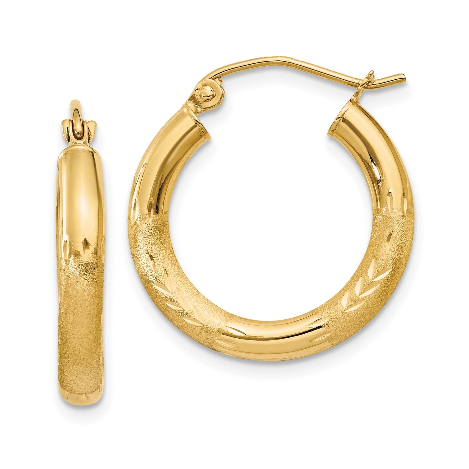 14k Yellow Gold Hoop Earrings, Satin and Polished Finish, Etched Leaf Design, Lightweight Classic Style