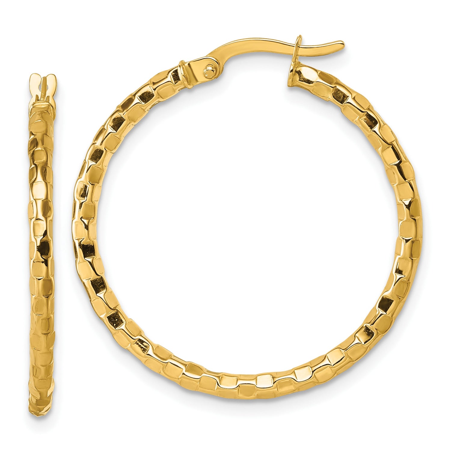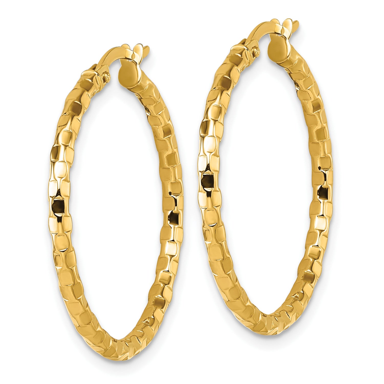 14k Yellow Gold Hoop Earrings, Textured Faceted Tube Design with High Shine Finish