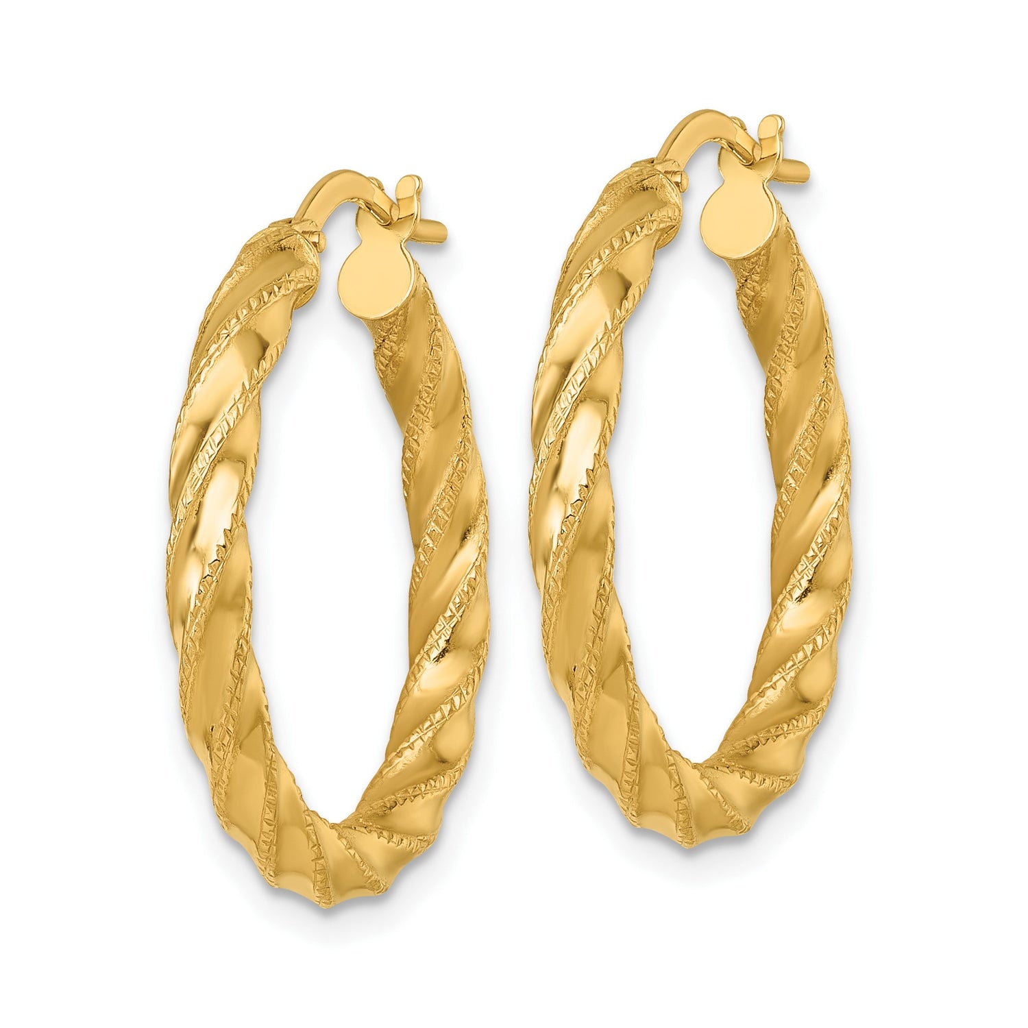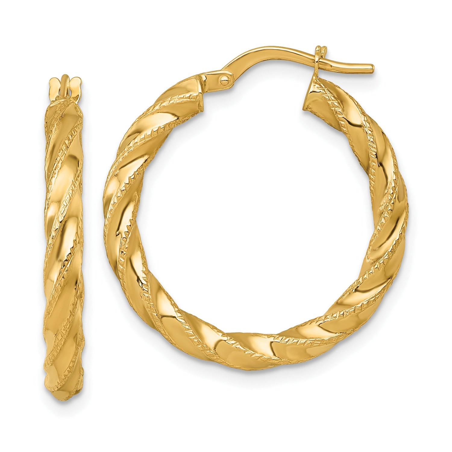 14k Yellow Gold Hoop Earrings, Twisted Tube Design, Polished Diamond-Cut Texture