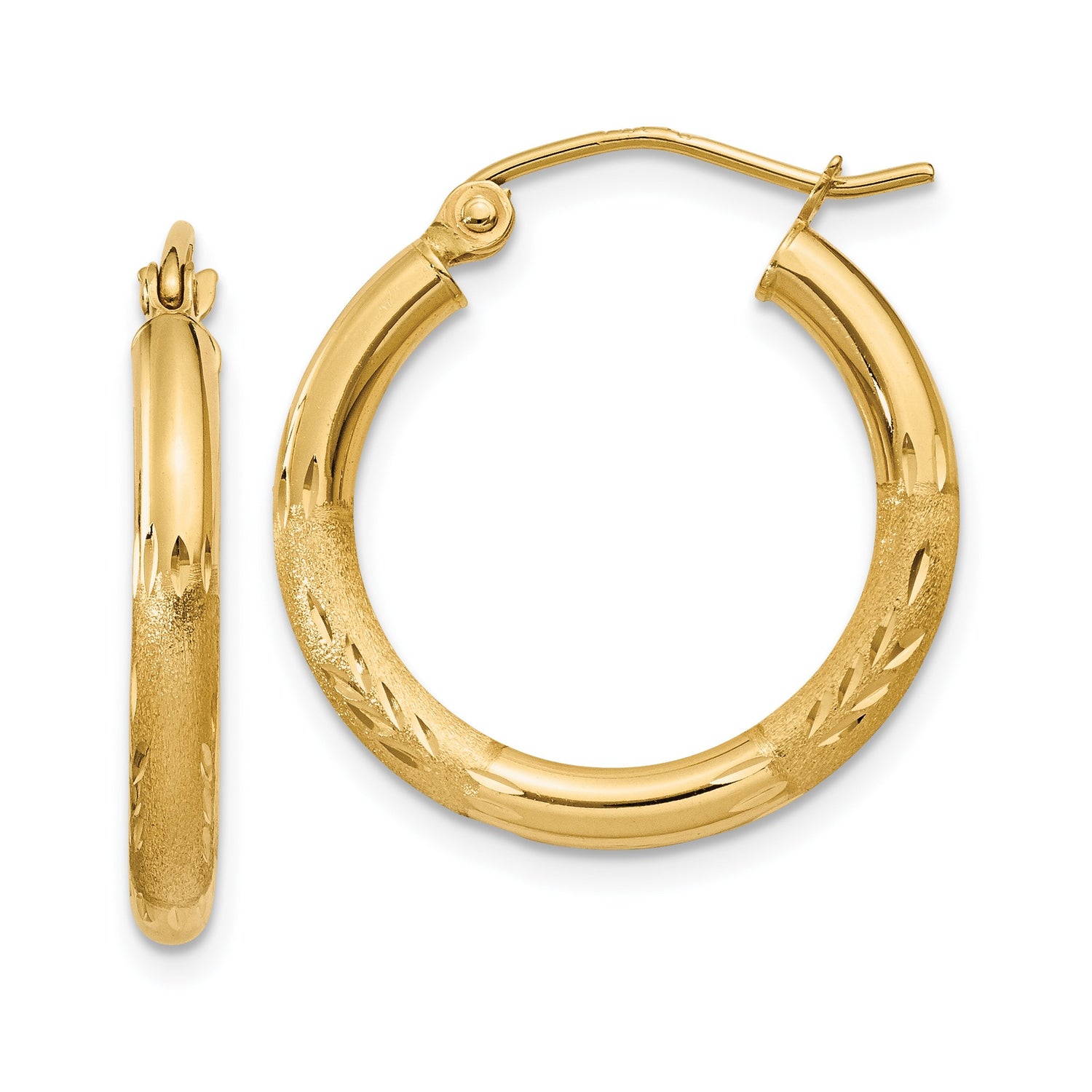 Featuring Diamond Cut Textured Hoops With A Modern Leaf Design, These Elegant Textured Gold Hoops Offer A Look That Is Equal Parts Contemporary And Timeless. Their Subtle Texture Reflects Light Beautifully While The Refined Yellow Gold Finish Brings Lasting Appeal To Any Jewelry Collection. Perfect As Non Religious Fashion Jewelry, These Simple Textured Gold Hoops Provide Stylish Sophistication With Subtle Detail.