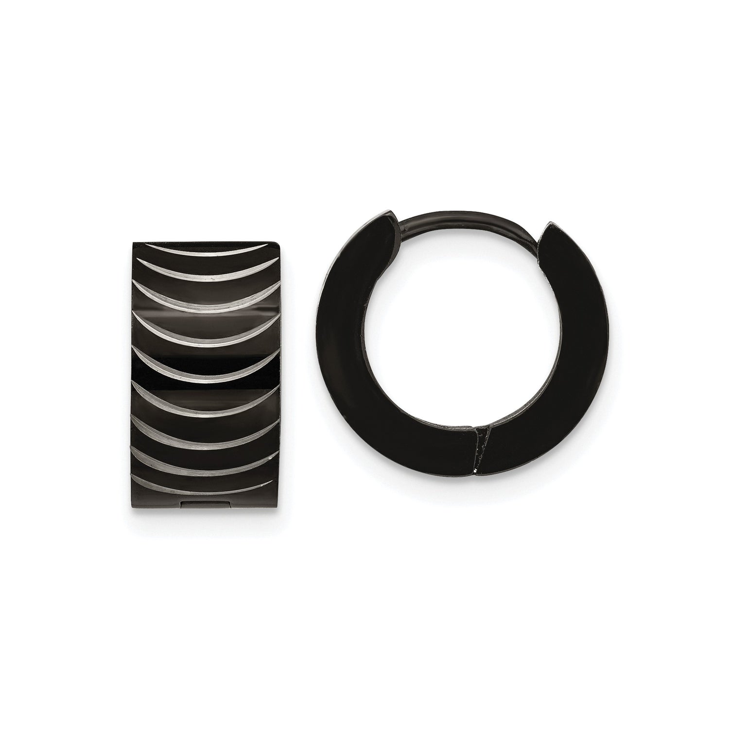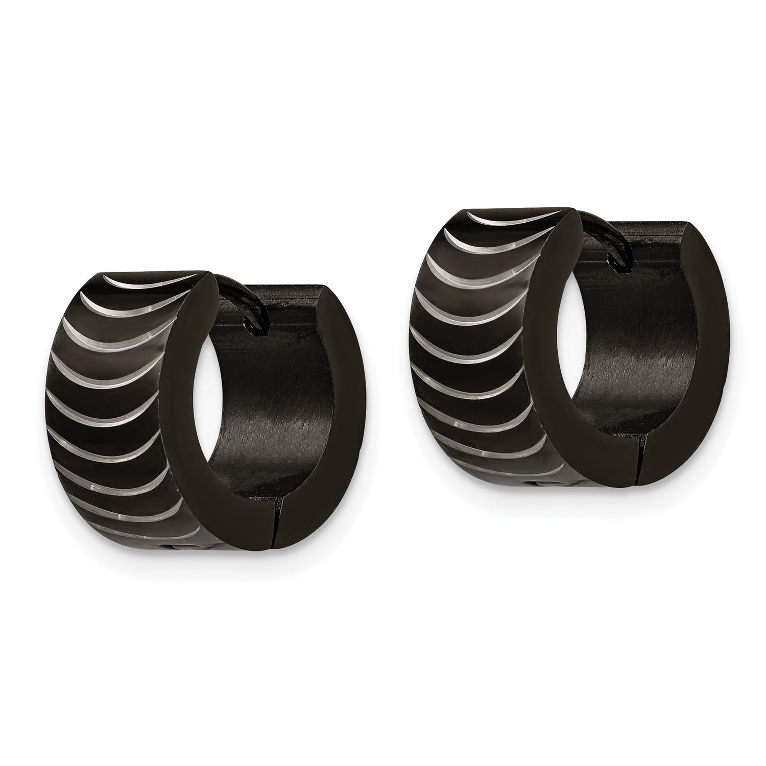 These modern minimalist hoop earrings boast a bold yet understated design that complements minimalist men's hoops and edgy urban attire alike. With clean engraved arc detailing and a sleek exterior, they stand out as fashionable black hoop earrings while maintaining versatility. The cool contrast of matte black against polished edges creates a balanced aesthetic ideal for those embracing modern steel men's earrings with an industrial vibe.
