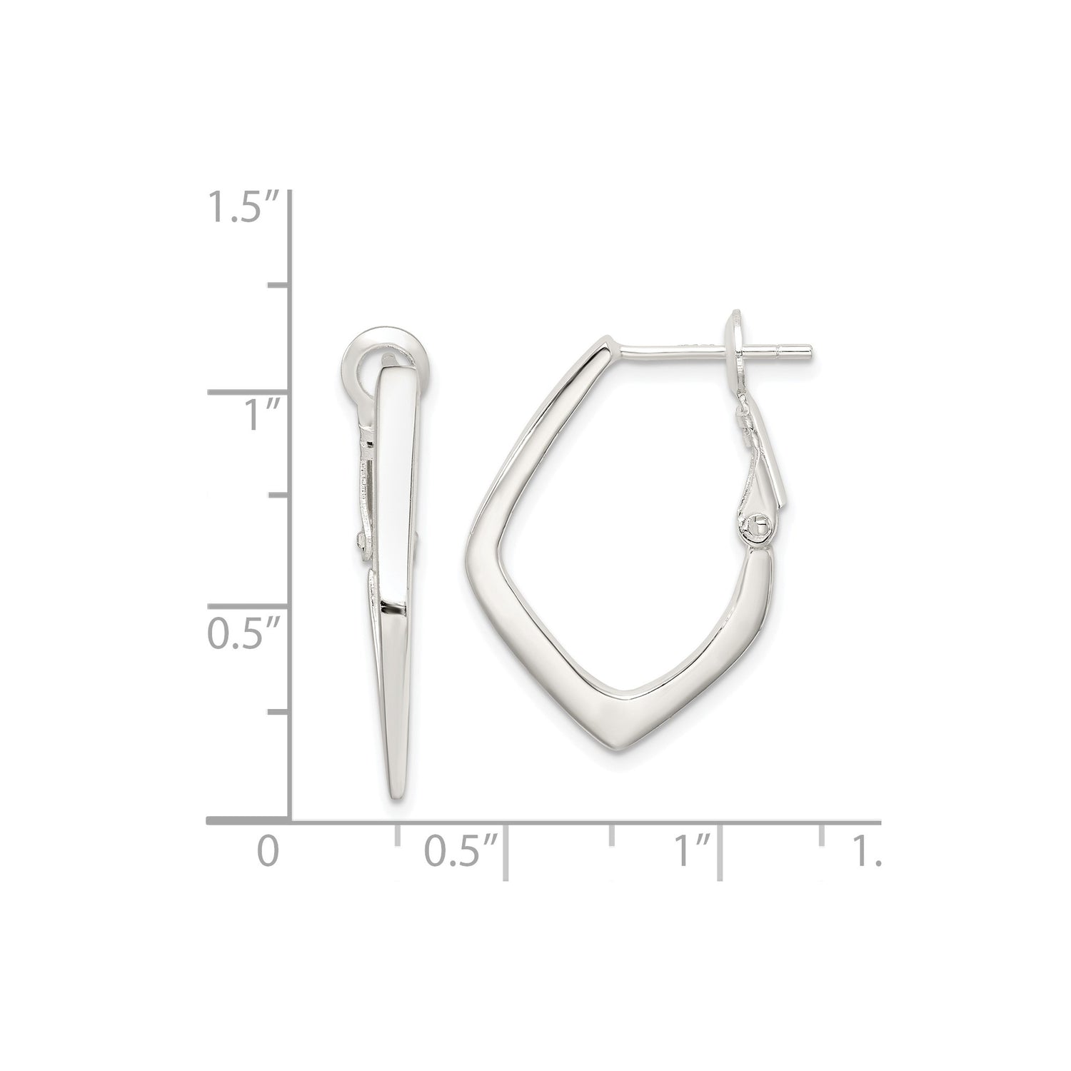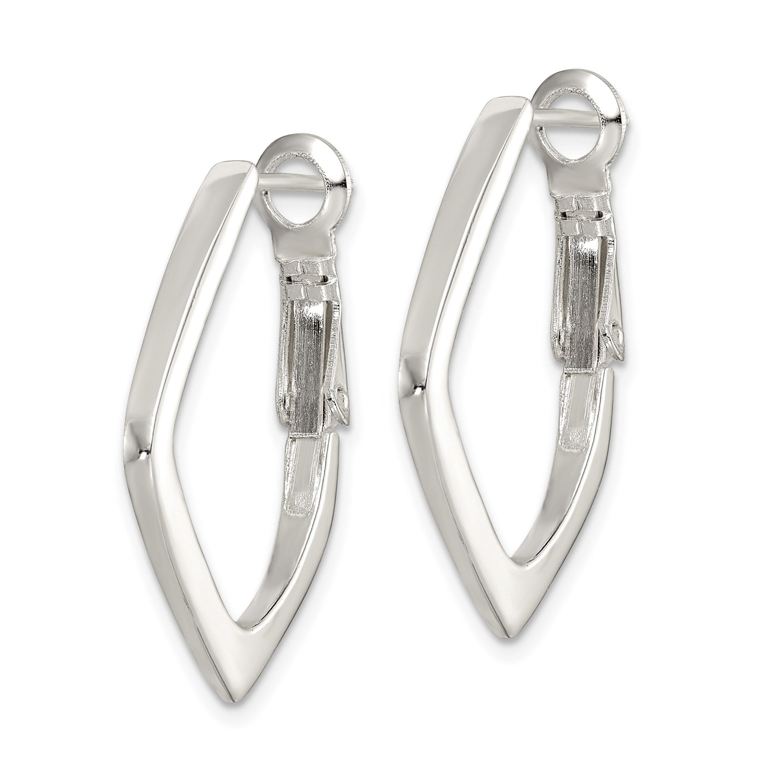 Featuring a unique geometric hoop design and contemporary v shape, these sterling hoops deliver urban refinement with an edge. The linear structure forms sleek silver v hoops that reflect the light beautifully, making them perfect for day-to-night wear. Their simple shape offers a minimalist statement while maintaining the timeless charm associated with sterling silver jewelry. These silver statement fashion earrings are both bold and understated in just the right proportions.